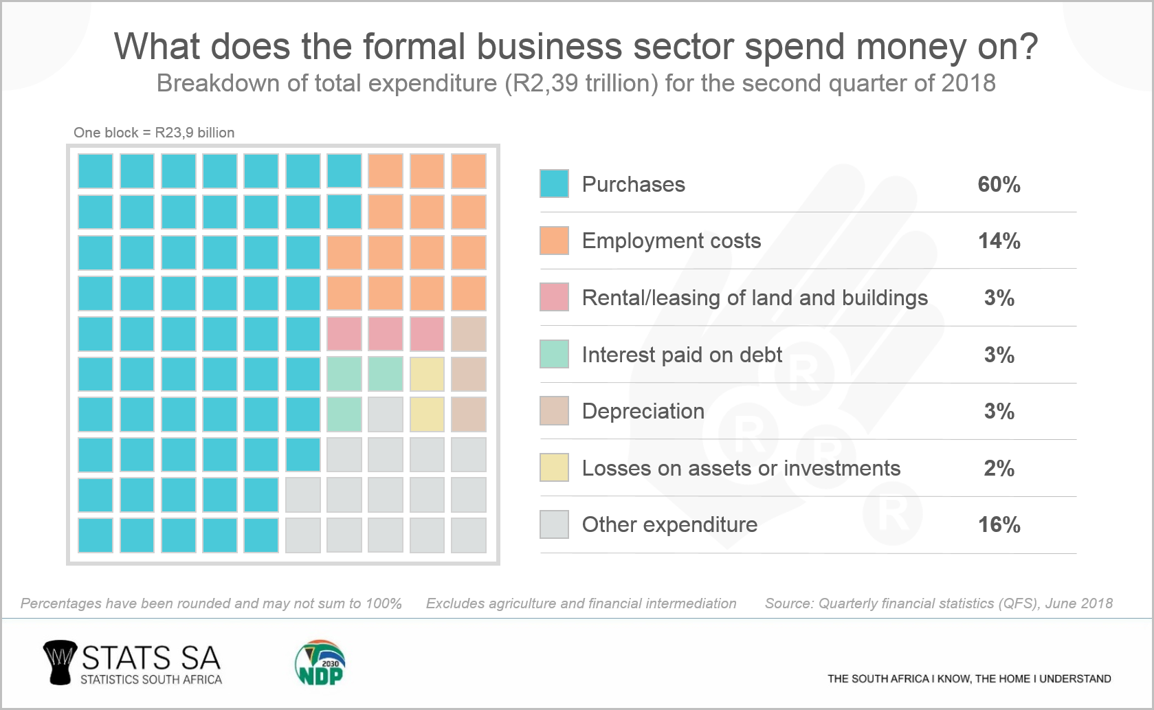 The formal business sector1 spent a total of R2,39 trillion in the second quarter of 2018, according to the latest Quarterly financial statistics (QFS) report (excluding capital expenditure). A rundown of the expenditure data, collected from a sample of about 4 500 businesses, shows that 60% was spent on purchases of goods such as raw materials, consumables, goods for resale, fuel and building materials.