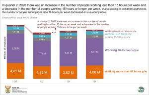 In quarter 2:2020 there was an increase in the number of people working less than 15 hours per week and a decrease in the number of people working 15 hours or longer per week. Due to easing of lockdown restrictions, the number of people working less than 15 hours per week decreased on a quarterly basis while the number of people working 15 hours or longer per week increased on a quarterly basis.