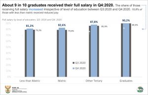 The proportion of those who worked from home decreased from 10,9% in quarter 3:2020 to 8,0% in quarter 4:2020. This is possibly a result of lockdown restrictions being relaxed in quarter 4, making it possible for more people to work from their usual place of work rather than working from home. Between the two quarters the share of those who received a full salary also increased, irrespective of education level, as depicted in the figure below, possibly as a result of longer hours being worked than in the previous quarter.