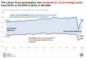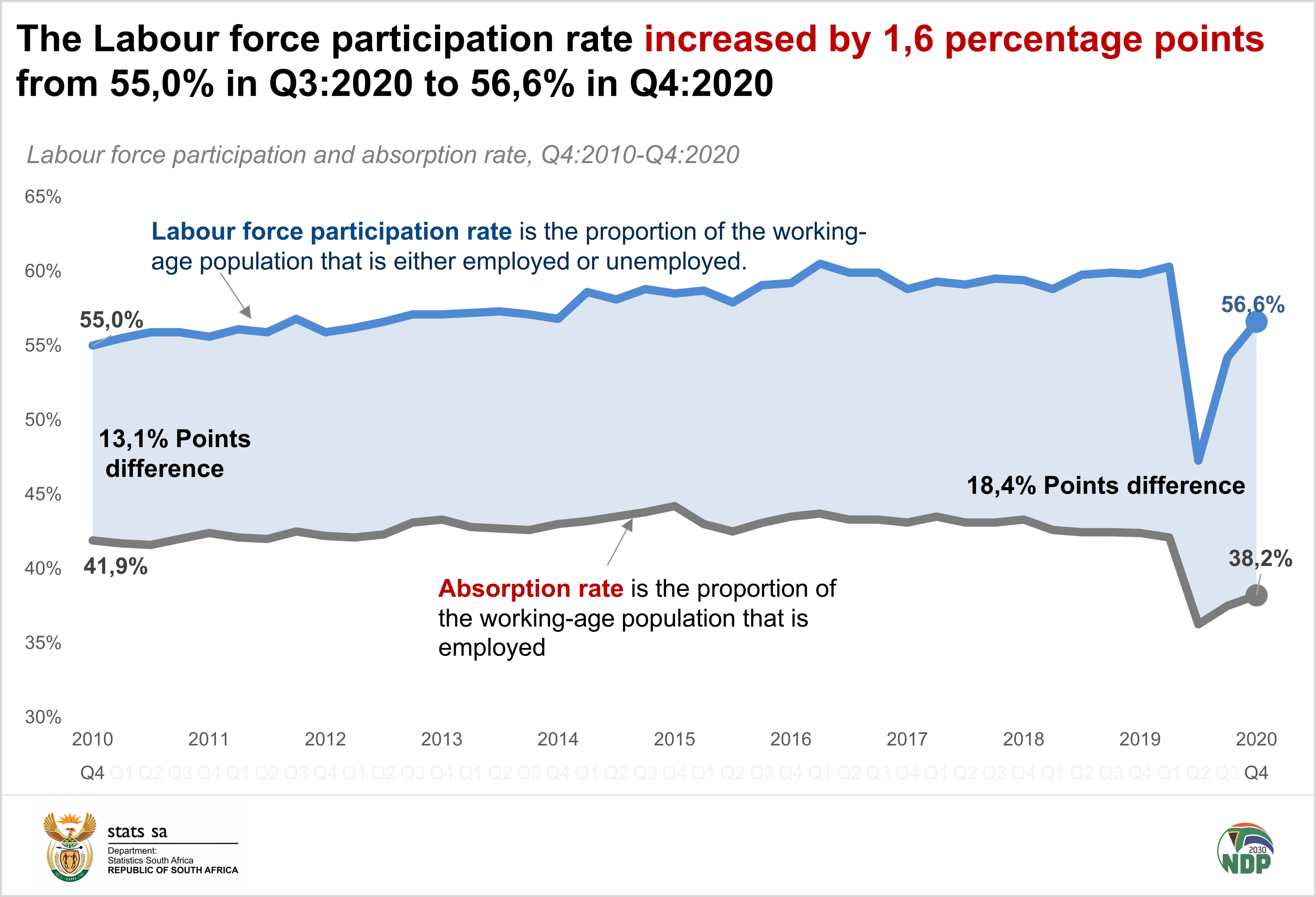 According to the Quarterly Labour Force Survey (QLFS), there was an increase of 333 000 in the number of employed persons, an increase of 701 000 in the number of unemployed persons and a decrease of 890 000 in the number of people who are out of the labour force, in the 4th quarter of 2020 compared to the previous quarter. These changes resulted in increases in all key labour market rates. The unemployment rate increased from 30,8% in quarter 3 of 2020 to 32,5% in quarter 4 of 2020, the highest unemployment rate recorded since the start of the QLFS in 2008. The absorption rate (employment-to-population ratio) increased from 37,5% to 38,2% and the labour force participation rate increased from 54,2% to 56,6% during this period, indicating that more people are participating in the labour market.