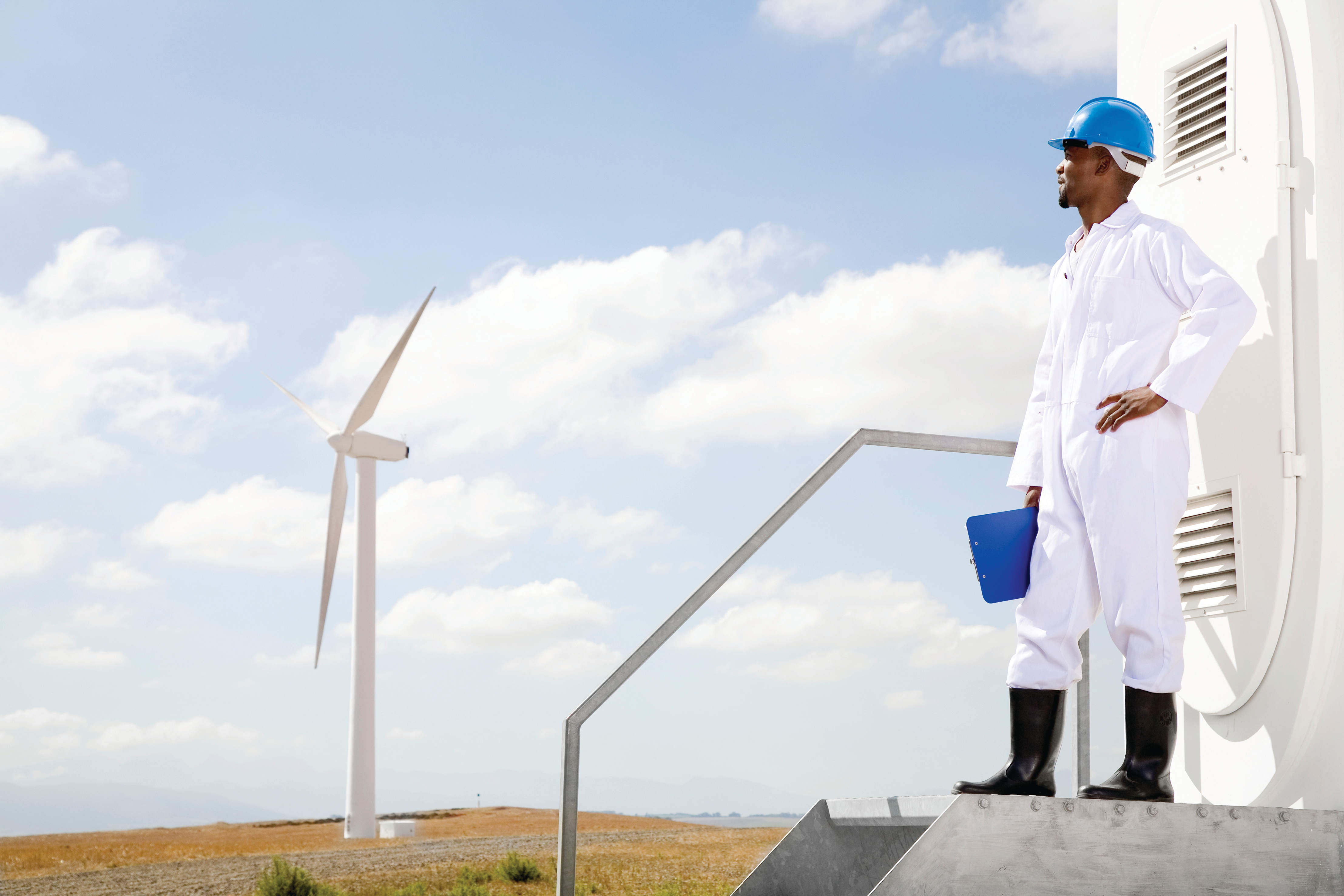 Man with hard hat and clip board looking over wind turbine field, Cape Town, Western Province, South Africa