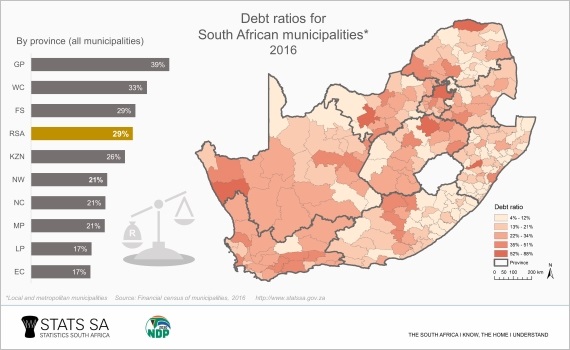 The three local municipalities with the highest debt ratio were Ngwathe in Free State (88%), Naledi in North West (65%) and Mpofana in KwaZulu-Natal (63%). Mhlontlo in Eastern Cape has the lowest at 4%. The metropolitan municipality with the highest debt ratio was Tshwane in Gauteng (56%).