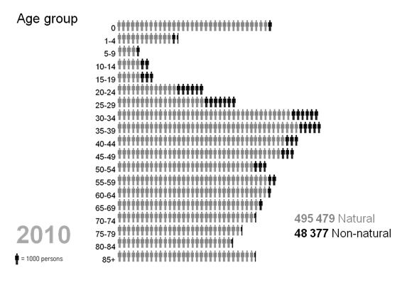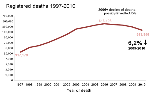 Starting in 2007, less people have been dying on an annual basis. The total number of deaths fell by 6.2% in 2010, as compared to 2009. More males than females died, and the highest number of deaths was recorded amongst people aged 30 – 39 years.