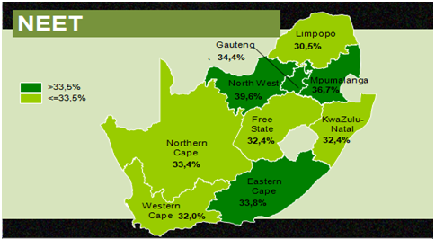 In every province, over 30% of young people aged 15-24 is NEET – ranging from 30,5% in Limpopo to 39,6% in North West (Figure 5).