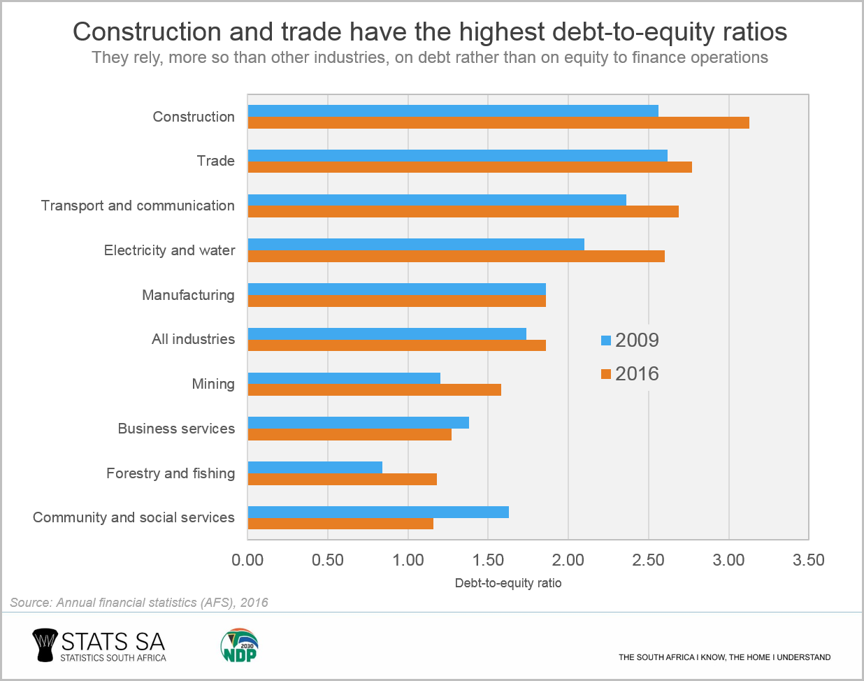 The rise in debt was observed in eight of the nine industries, according to Stats SA’s latest Annual financial statistics (AFS) release2. Industries reporting an increase in debt in 2016 compared with 2015 were forestry and fishing (up 19,4%), construction (up 16,9%), transport and communication (up 12,2%), trade (up 11,8%), community, social and personal services (up 11,6%), electricity and water supply (up 11,4%), manufacturing (up 8,9%) and business services (up 1,4%).