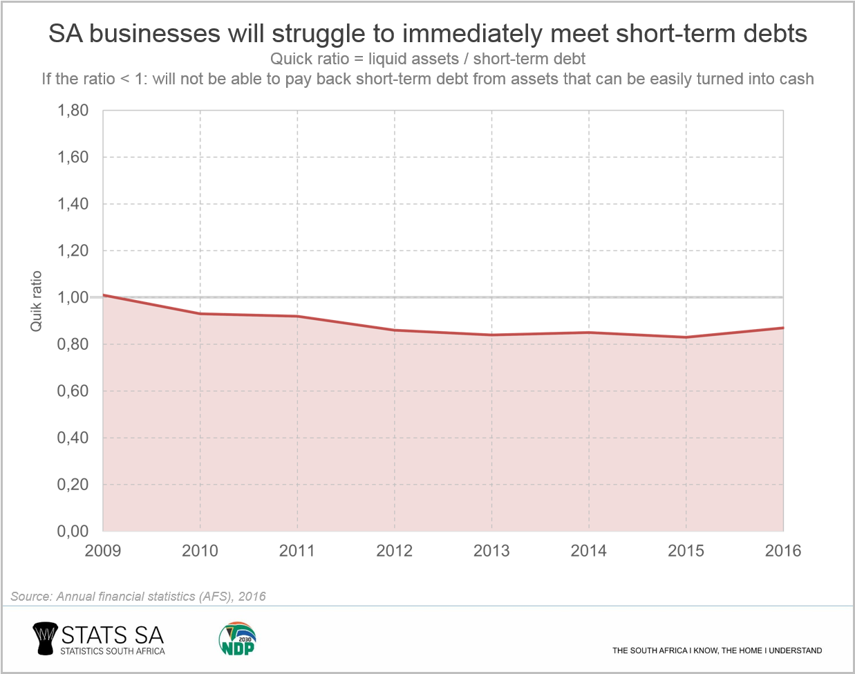 The quick ratio for the South African formal business sector was 0,87 in 2016, lower than the ratio of 1,01 recorded in 2009. For every rand of short-term debt in 2016, businesses had 87c in the form of liquid assets. This is not enough to immediately pay back short-term liabilities.