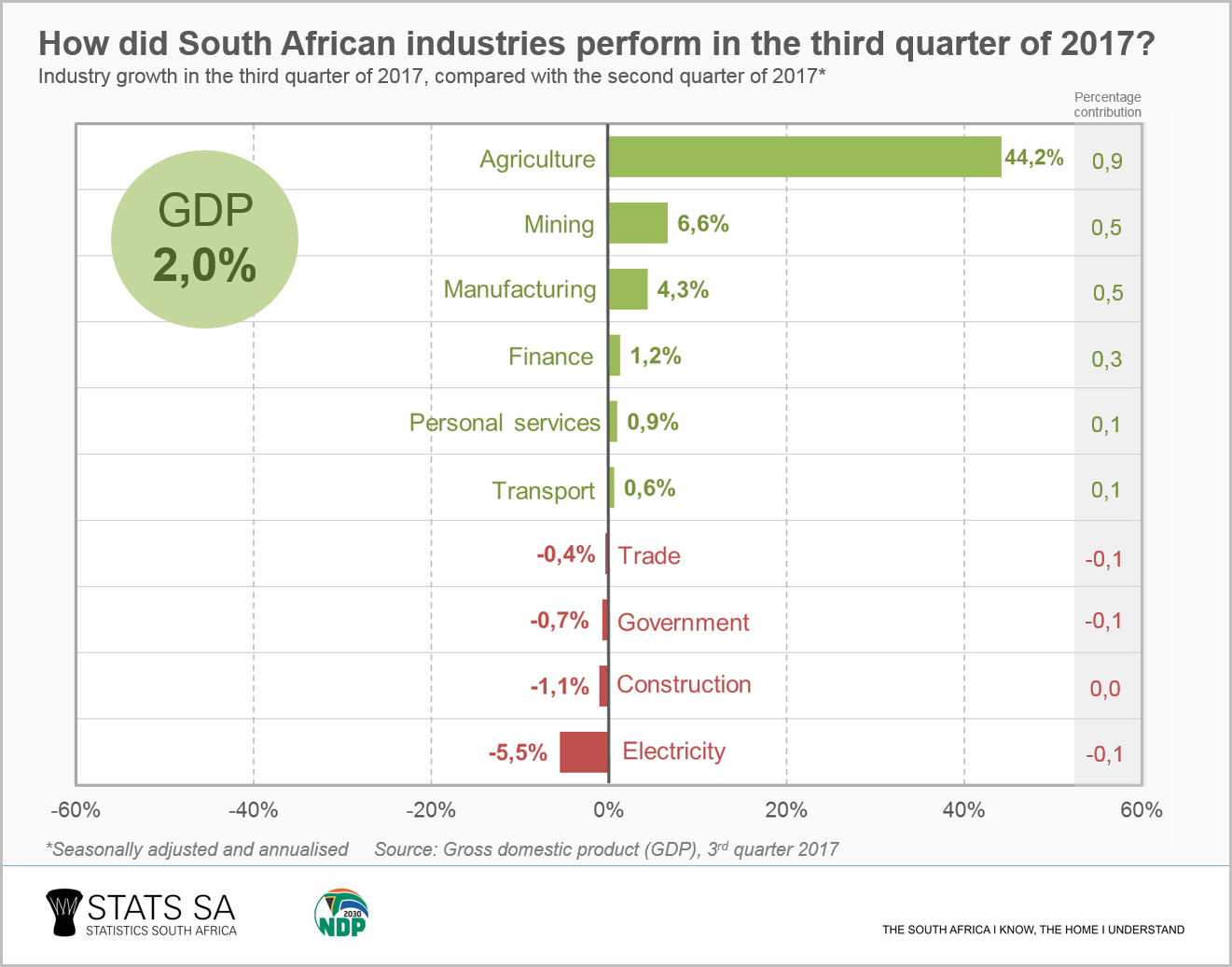 The South African economy grew by 2,0% in the third quarter of 2017 (seasonally adjusted and annualised), down from a revised 2,8% in the second quarter. Agriculture, mining and manufacturing were the main drivers of the expansion, while there was a contraction in general government services resulting from low employment numbers in the public sector.