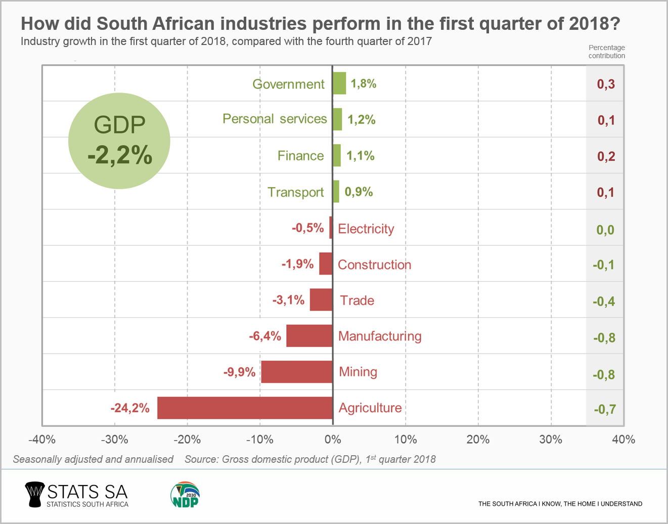 After growing by 3,1% in the fourth quarter of 2017, the South Africa economy wobbled in the first quarter of 2018, shrinking by 2,2% quarter-on-quarter (seasonally adjusted and annualised). Agriculture, mining and manufacturing were the main contributors to the slowdown, with the electricity, construction and trade industries also recording negative growth.
