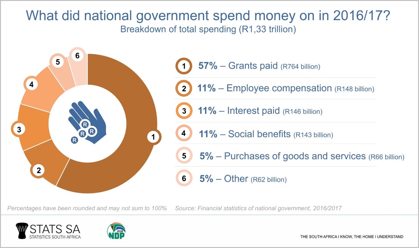 Stats SA’s most recent release of data on national government finances, in the Financial statistics of national government1 report, shows that national government spent a total of R1,33 trillion in 2016/17. This is 4% higher than the R1,28 trillion spent in 2015/16.