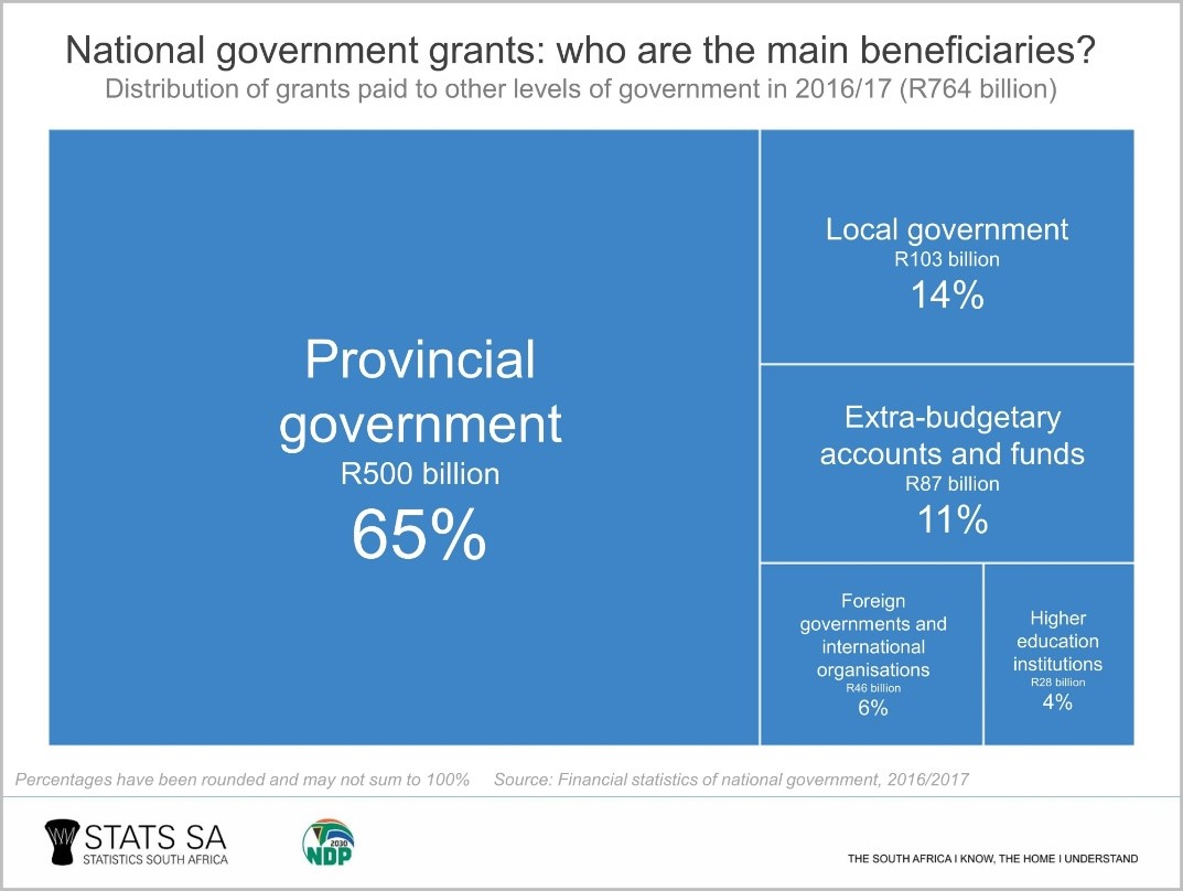 Provincial government received the bulk of grants in 2016/17, almost two-thirds of the R764 billion. This was 6% more than the amount received in 2015/16. This is expected, as the nine provinces are responsible for administering some of the core functions of government (for example, education and health).  About 14% of the financial grants were transferred to the 257 municipalities. Just over 11% (or R87 billion) was paid to South Africa’s 252 extra-budgetary accounts and funds (8% more than in 2015/16).