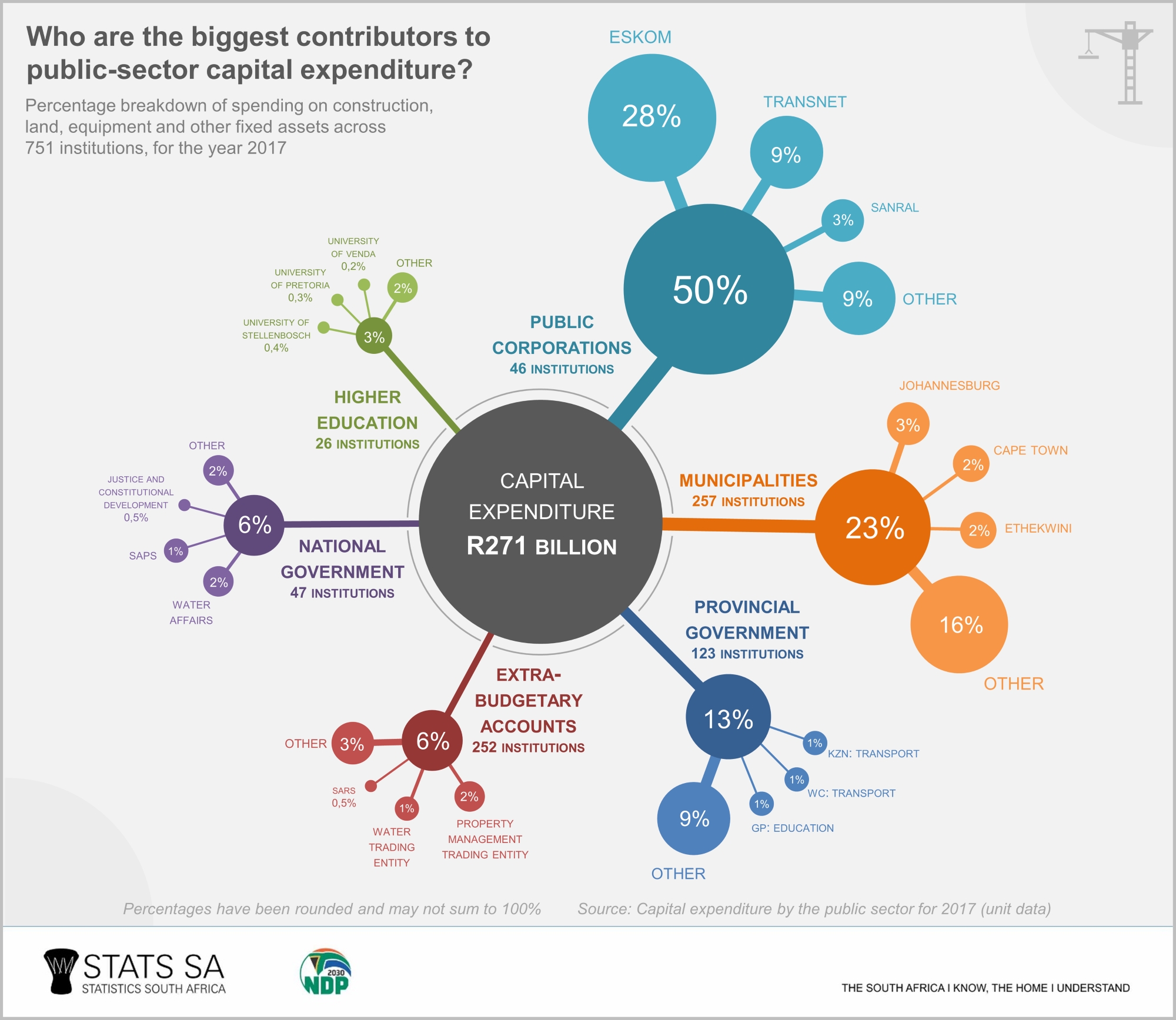 Eskom and Transnet were the two biggest public-sector spenders on fixed assets, with Eskom responsible for 28% of total capital expenditure while Transnet was in second spot at 9%. Eskom increased its capital expenditure to R75,7 billion in 2017 from R73,0 billion in 2016, mainly due to its work on the Kusile power station.