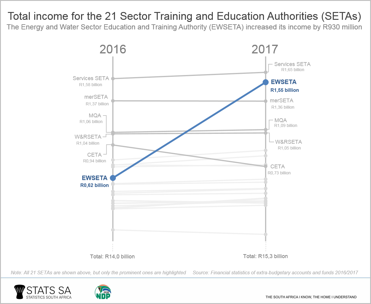 Notice the jump in the amount of income received by the Energy and Water Sector Education and Training Authority (EWSETA)? A cash injection from the Department of Water and Sanitation pushed EWSETA up the ranks from 10th in 2016 to 2nd in 2017 in terms of income received by the SETAs.
