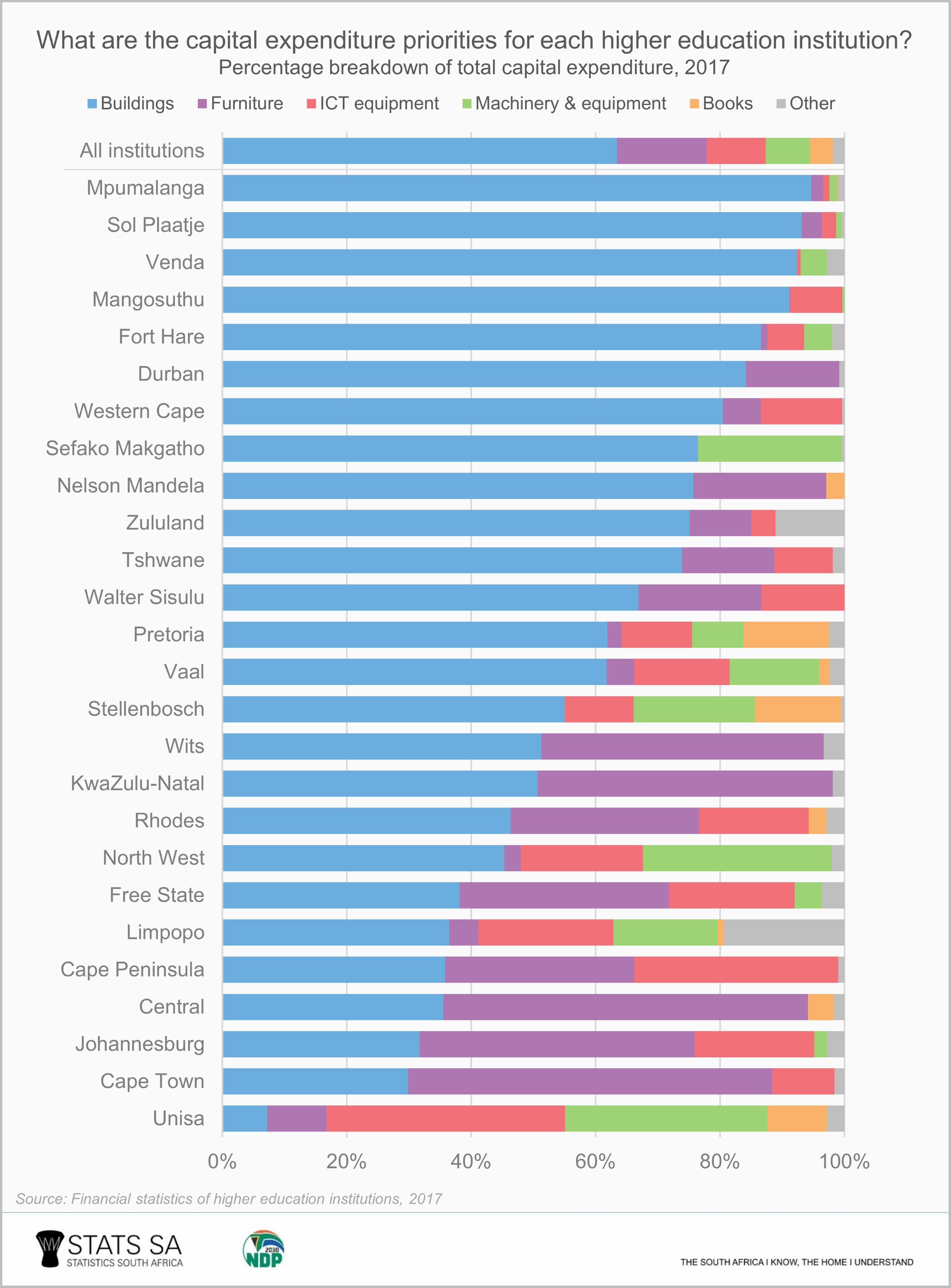 Who were the biggest spenders on fixed assets in 2017? The University of Pretoria took the lead, contributing R738 million (or 13%) to total higher education capital expenditure. Stellenbosch University and the University of Mpumalanga took second (10%) and third (9%) spots, respectively.