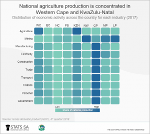 Agriculture and mining are the two exceptions. National agriculture production is mostly concentrated in Western Cape and KwaZulu-Natal. The bulk of national mining activity takes place in North West, Mpumalanga and Limpopo.