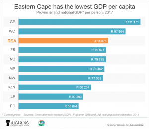 Eastern Cape, on the other hand, was the lowest ranking province. Even if Eastern Cape were able to double its GDP per capita, it would still be slightly lower than that of Gauteng.