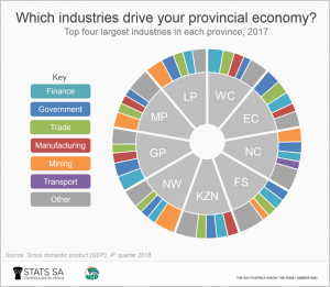 GDP per capita can be boosted if dominant industries in each province grow at a rate that outstrips population growth. Each province has its own unique industrial makeup. Western Cape, for example, is dominated by the finance and business services, trade, and manufacturing industries.