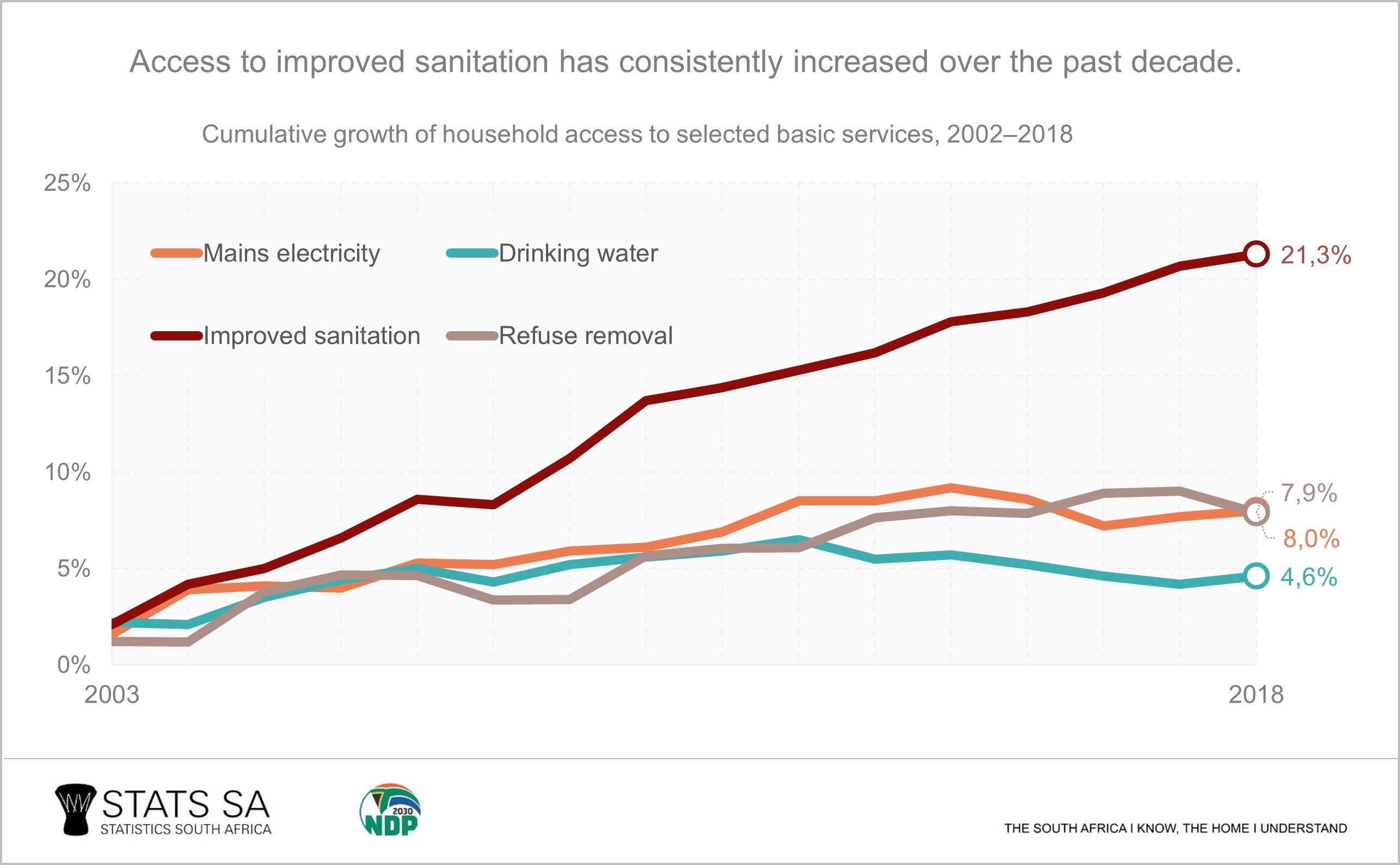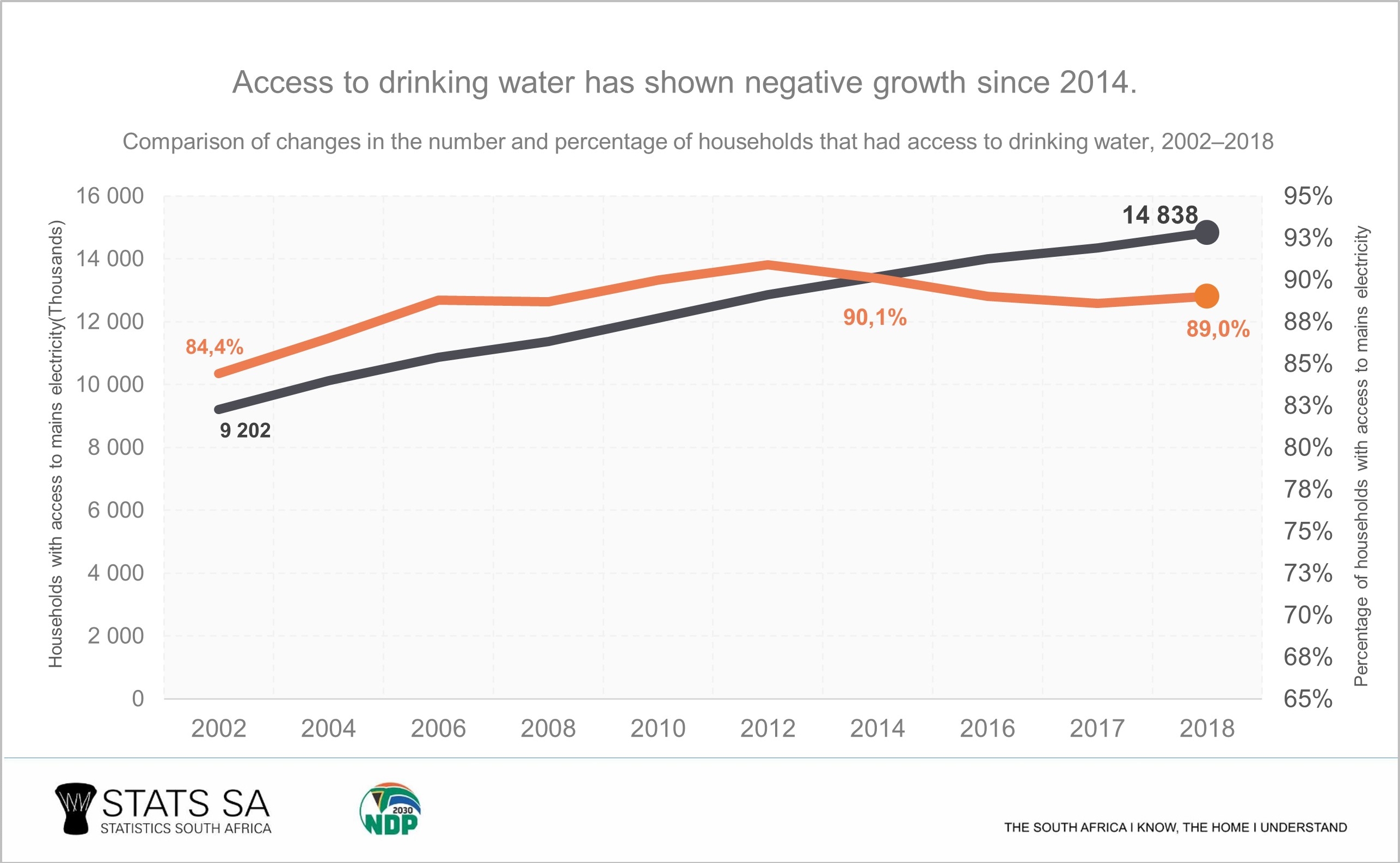Although the percentages tell a compelling story, it is important to note that the number of households increased by 48,9% between 2002 and 2018, a growth of 2,4% per annum. Since households are the basic unit for service delivery, rapid household growth will constrain the ability of authorities to deliver basic services. Apparent declines in the percentage access to some basic services, however, hide the fact that the number of households with access to the particular services continued to grow from year to year, albeit at a slower pace. In the case of water, the number of households with access to water increased from 13,4 to 14,8 million, even while percentage access seems to have stabilised.