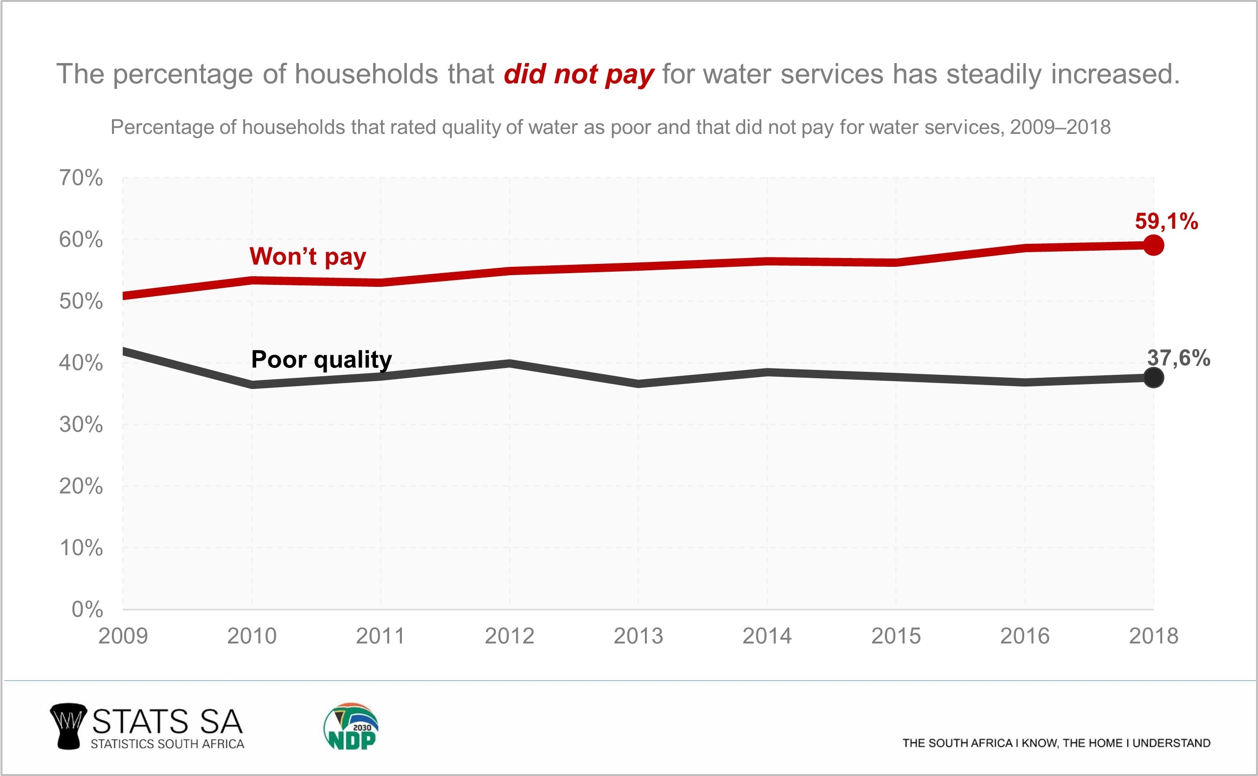 Despite improvements in access to drinking water, more than one-third (37,6%) of households rated the quality of water services they received as average or poor in 2018, while 59,1% did not pay for the water they received. The percentage of households that did not pay for water services has steadily increased from 50,8% in 2009 to 59% in 2018.