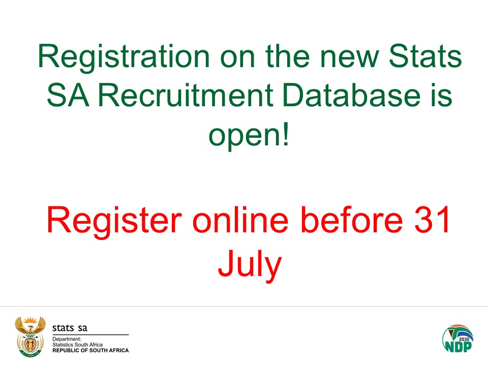 Stats SA wishes to emphasise that the registration process is free, and that no payment will be requested at any stage of the registration process or if you are called for employment opportunities. If you receive communications of this nature, please report it to your local authorities.