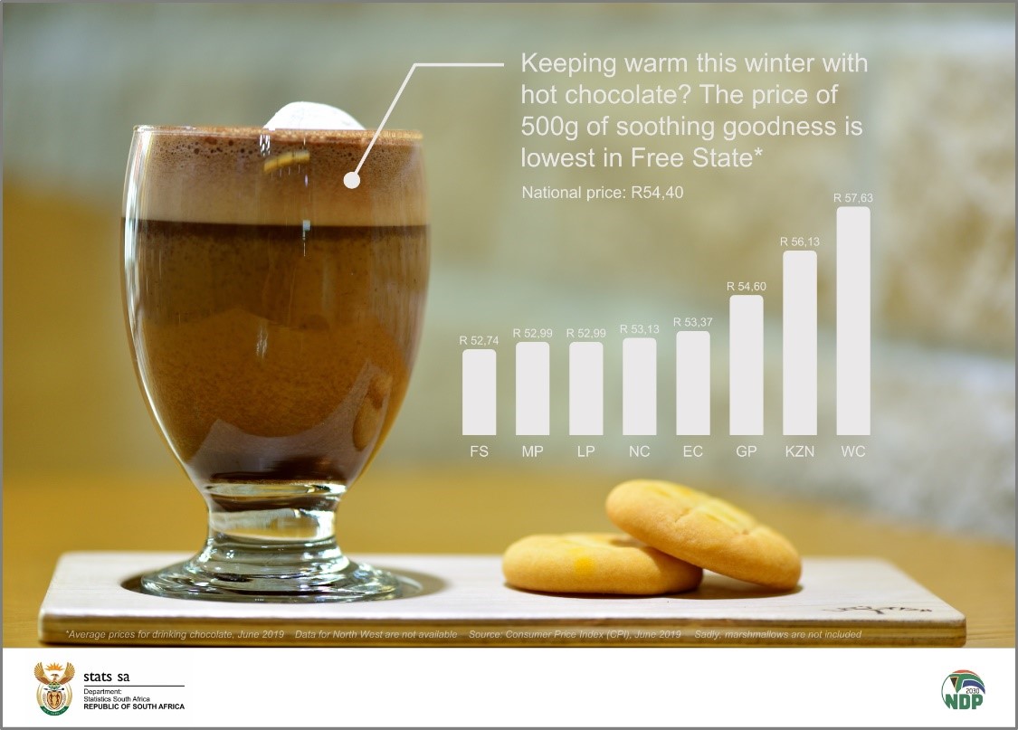 If we break this down by province, the average price of 500g of drinking chocolate in Free State was R52,74 in June 2019, cheaper than the R57,63 recorded for Western Cape.