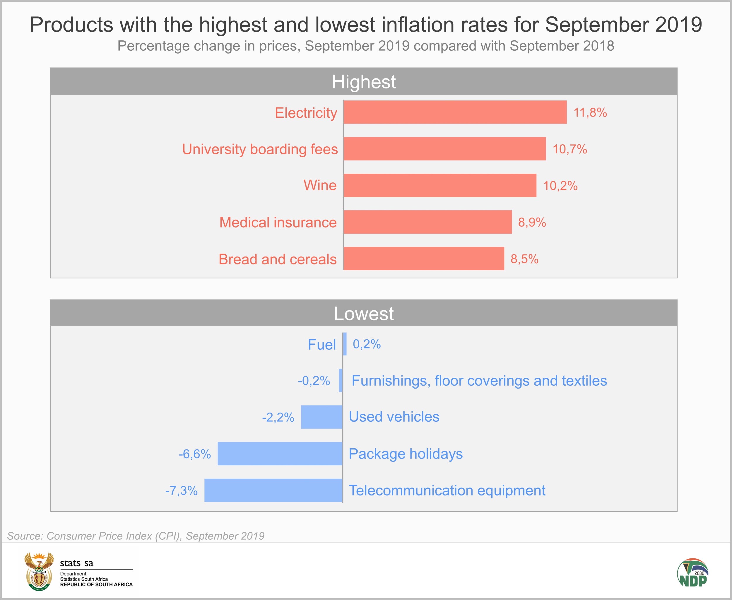 The product groups that had the highest annual price increases in September were electricity and university boarding fees. In terms of electricity, the National Energy Regulator of South Africa (Nersa) sets electricity prices and tariffs while taking a range of factors into account. Electricity supply in recent years has also been characterised by increasing costs in an environment of low economic growth, contributing to the rise in prices.