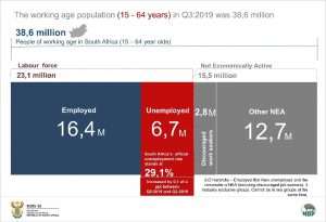 South Africa’s unemployment rate increased by 0,1 of a percentage point to 29,1% in Q3 of 2019. According to the Quarterly Labour Force Survey (QLFS) released by Statistics South Africa, this is the highest unemployment rate since Stats SA started measuring unemployment using the QLFS in 2008.