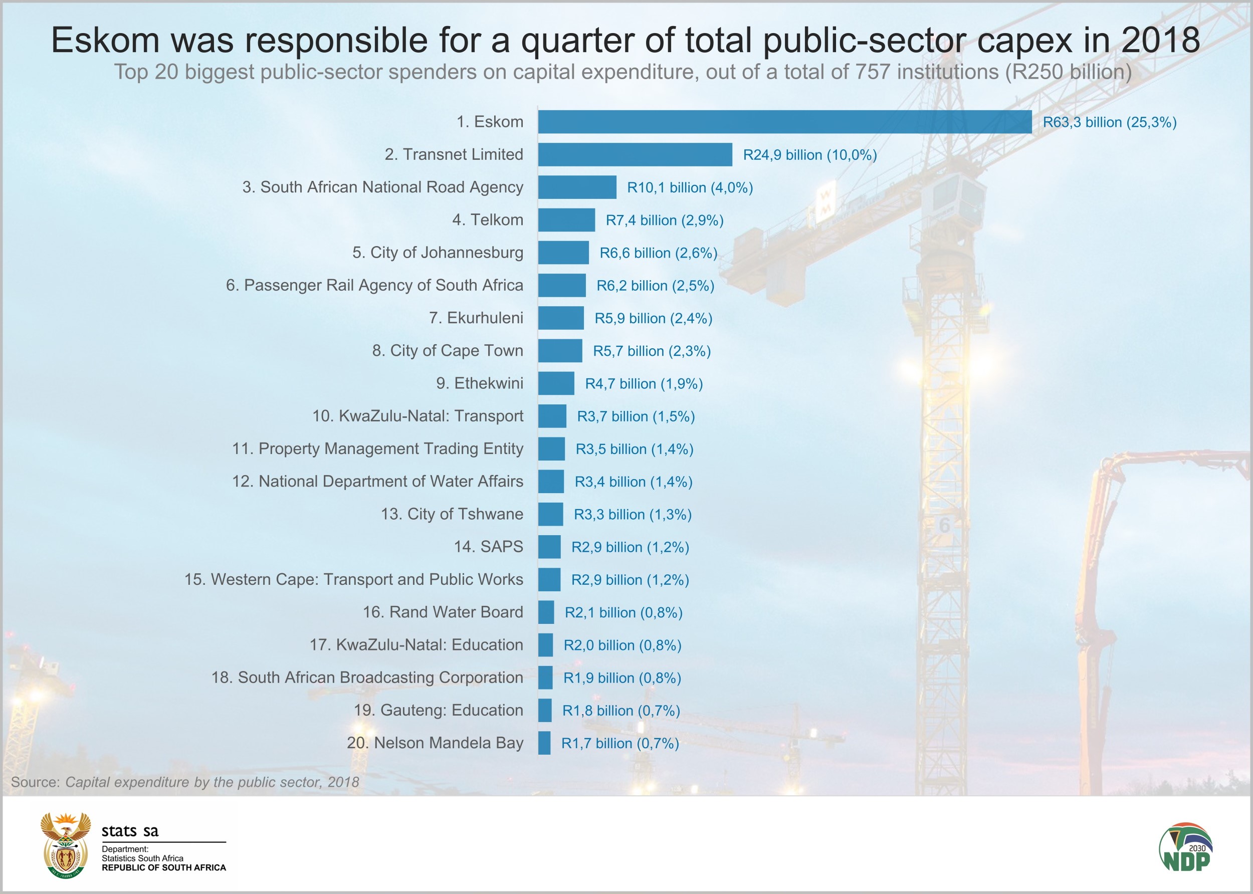 Eskom remains the single largest contributor to total public sector capital expenditure, even after reducing spending in 2018. South Africa’s largest power producer was responsible for just over a quarter (R63 billion) of the R250 billion public sector capital-spend. This amount was mainly focused on the power generation projects at Kusile, new electricity distribution programmes, and vehicle build programmes.
