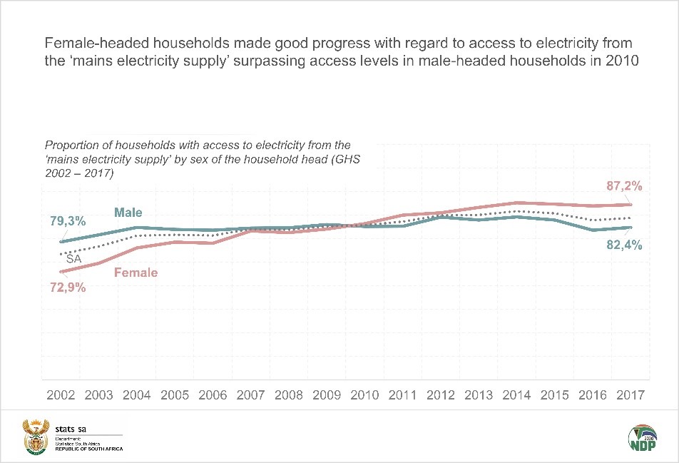 Female-headed households made good progress regarding access to electricity from the mains electricity supply as they surpassed access levels in male-headed households in 2010 and have since, remained higher. Access levels in male-headed households stayed fairly flat, increasing by only 3,1 percentage points between 2002 and 2017 while female-headed households saw their access levels improve by 14,3 percentage points over the same period.