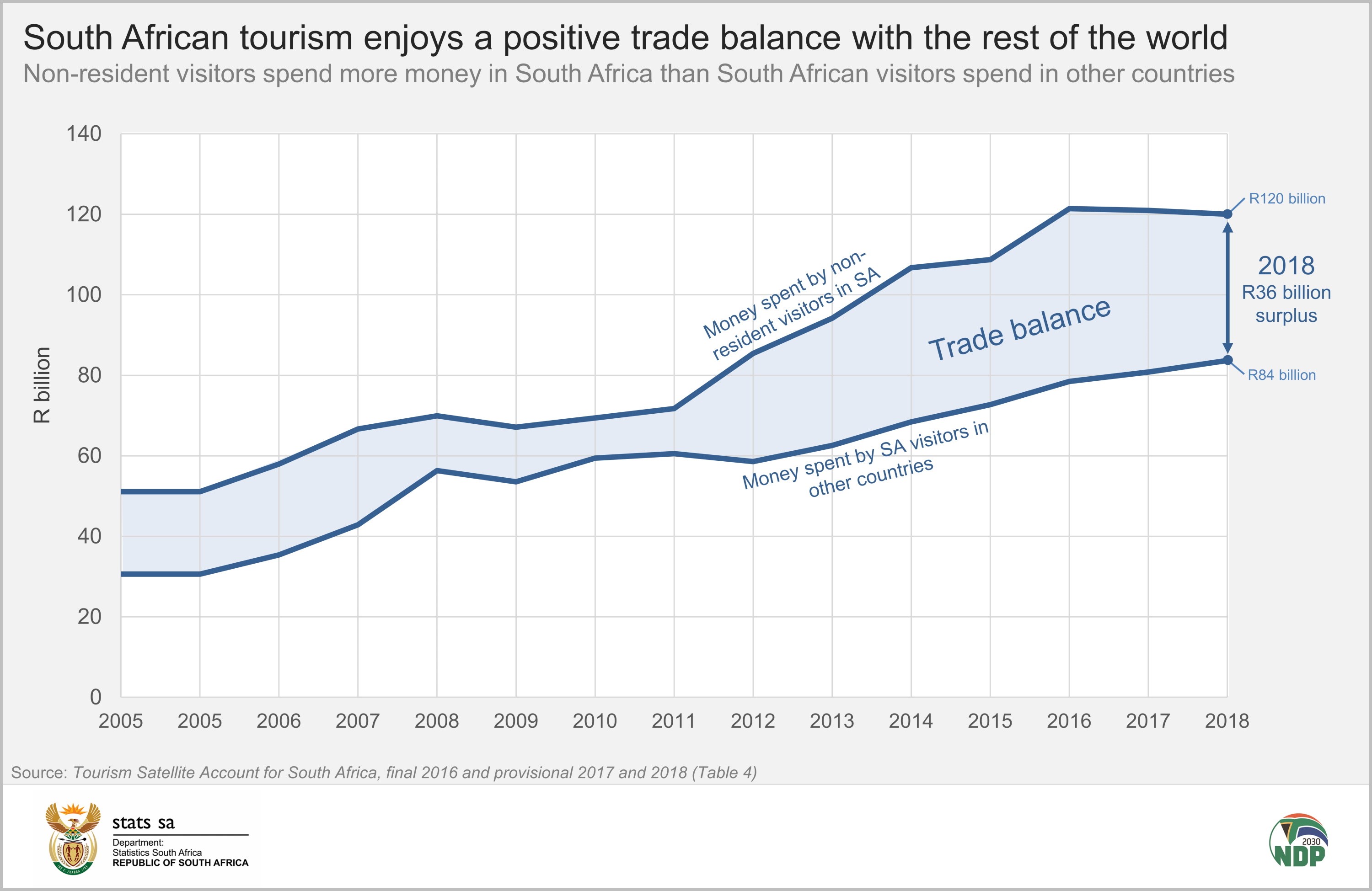 Since 2016, the tourism trade surplus has fallen. If you look at the top line in the graph, you will notice a slight drop in non-resident visitor expenditure for both 2017 and 2018. In other words, non-resident visitors have spent less in South Africa since 2016. South Africans travelling abroad, however, increased their expenditure over the same period.