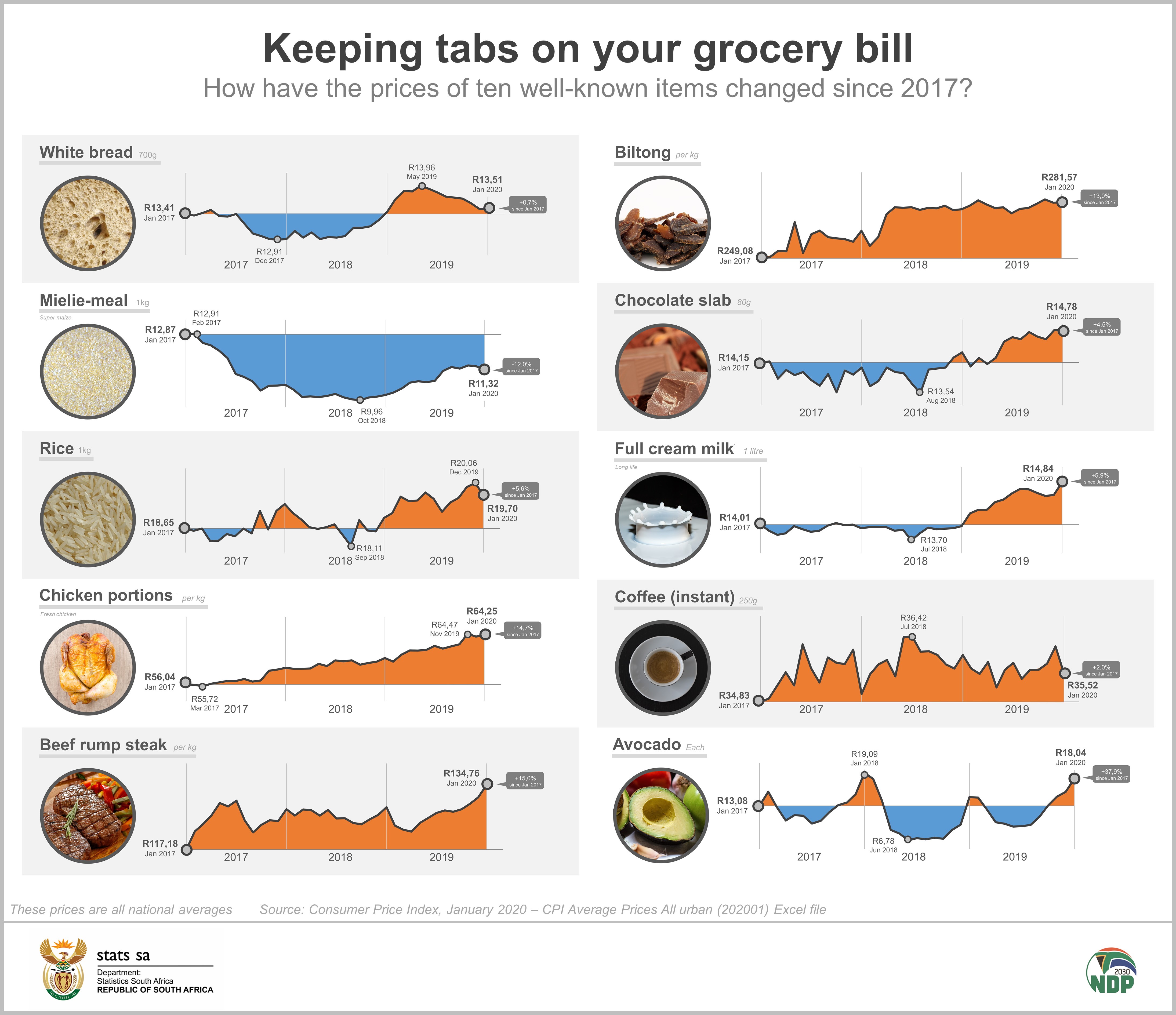 Previously available to researchers on request, Stats SA decided – from February 2020 onwards – to release the list to a wider audience on our website. To explore the data for yourself, download the CPI_Average Prices_All urban and CPI_Average prices_Provinces Excel files from the Consumer Price Index (CPI) release download page, under the Time series data section. One file covers national data while the other offers a provincial breakdown.