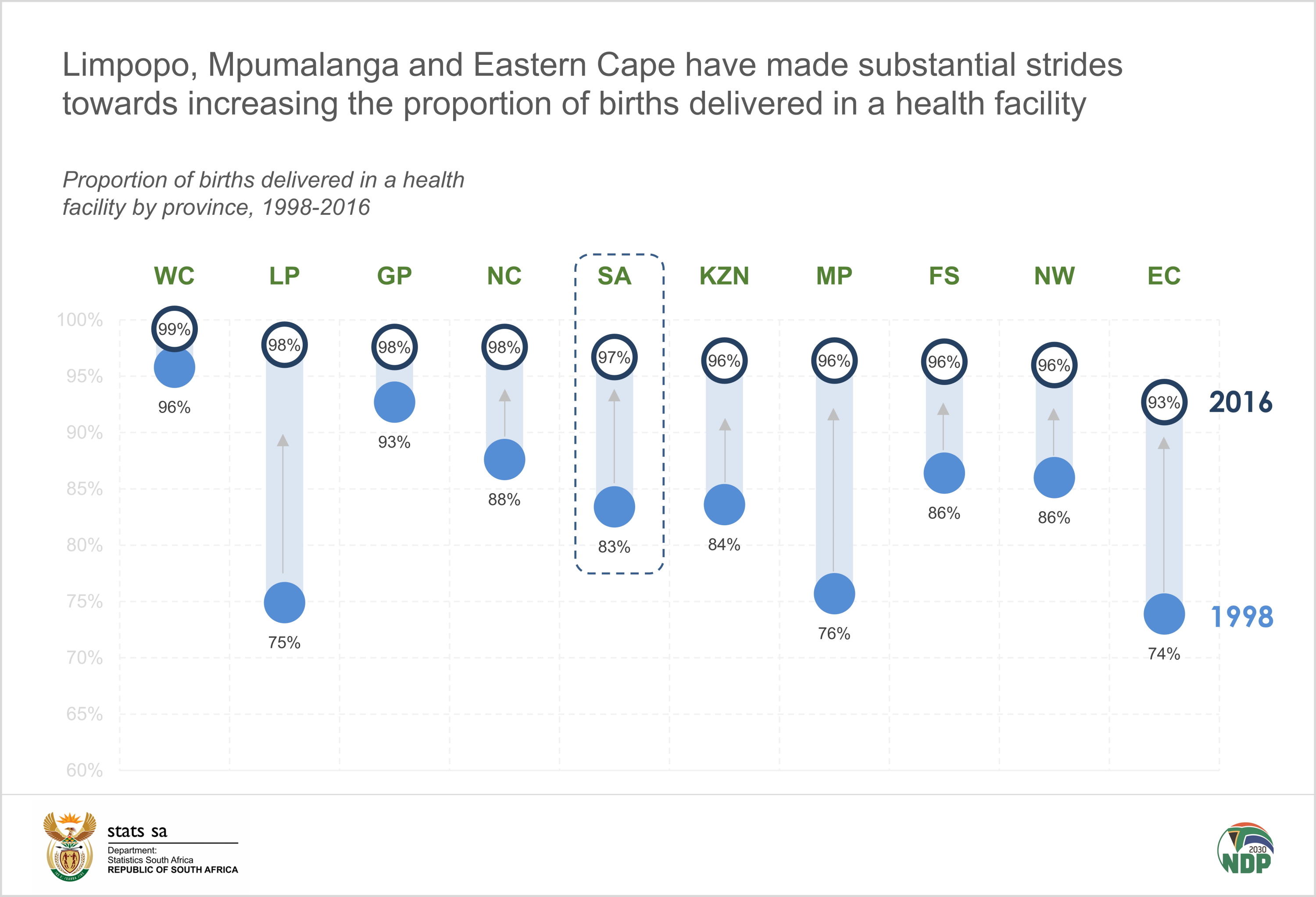 According to “Maternal Health Indicators: Further Analysis of the 1998 and 2016 South Africa Demographic and Health report”, released by Statistics South Africa, maternal healthcare utilisation has increased significantly between 1998 and 2016. Nationally, deliveries in a health facility increased from 83,4% in 1998 to 96,7% in 2016. Home deliveries decreased from 14% in 1998 to 4% in 2016.
