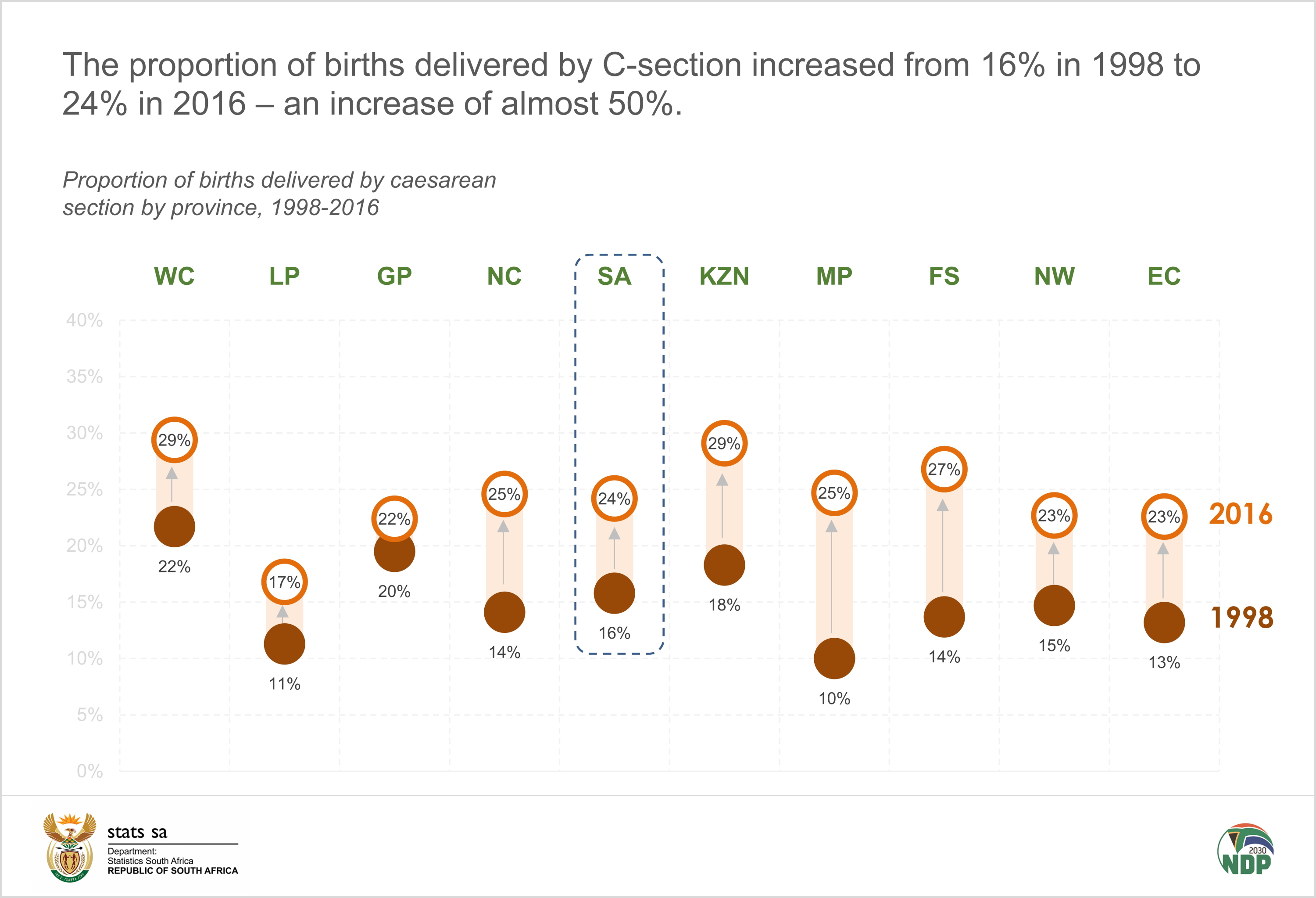 Among births in the 5 years before the survey, the proportion of births delivered by C-section increased from 16% in 1998 to 24% in 2016 – an increase of almost 50%. The SADHS 2016 has shown that six in ten births (61%) delivered at private health facilities are caesarean births, as compared with 22% of births delivered at public health facilities. Women aged 40–44 showed a higher proportion of deliveries by C-section (33,3%), compared to women aged 35–39 (26,6%) in 2016.