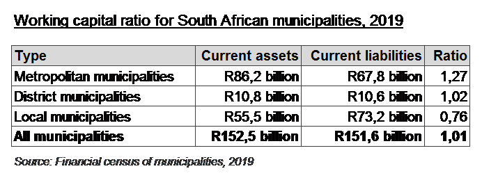 South African municipalities had slightly more current assets than current liabilities in 2019, according to the latest Financial census of municipalities report. Dividing current assets (R152,5 billion) by current liabilities (R151,6 billion), the working capital ratio comes to 1,01.