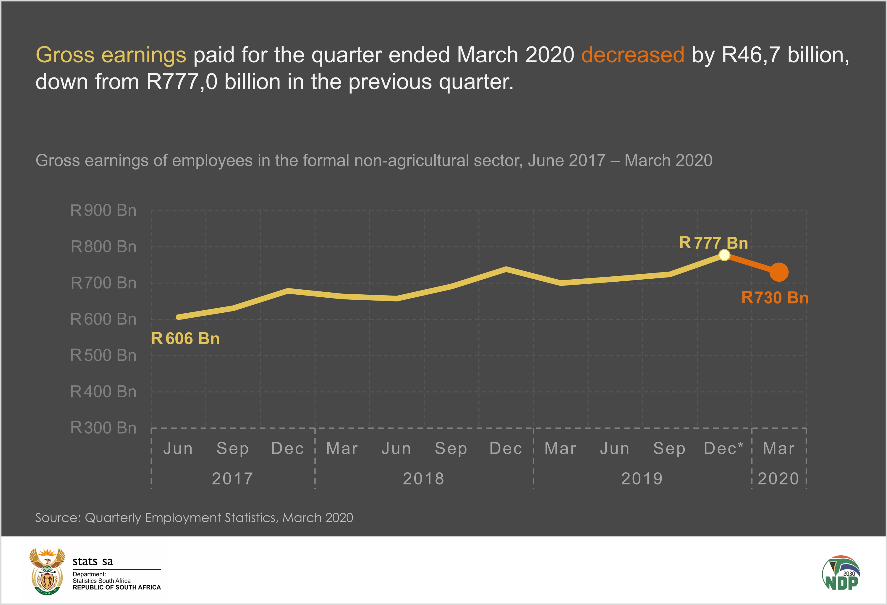 Gross earnings paid for the quarter ended March 2020 decreased by R46,7 billion when compared to the previous quarter. The total amount of gross earnings estimated for the quarter was R730,3 billion. This is down from R777,0 billion in the previous quarter. There was a 4,3% year-on-year increase in earnings in the current quarter compared with March 2019, amounting to R30,0 billion.