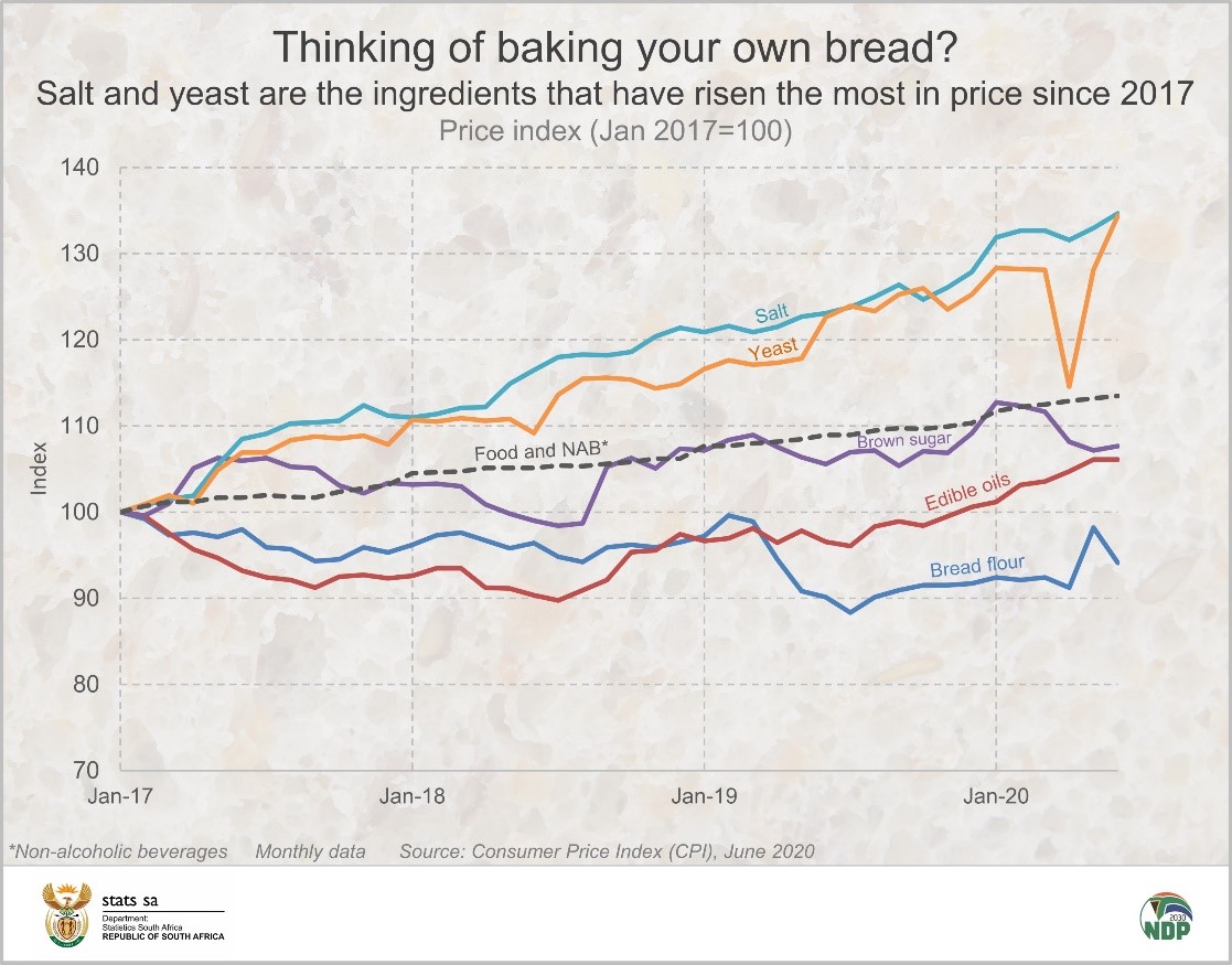 Instant yeast was a close second, rising (see what we did there?) by 34,4%. A 10 g sachet would have set you back R3,74 in January 2017, increasing to R5,24 in June 2020. Price indices for salt and instant yeast increased faster than the index recorded for food and non-alcoholic beverages.