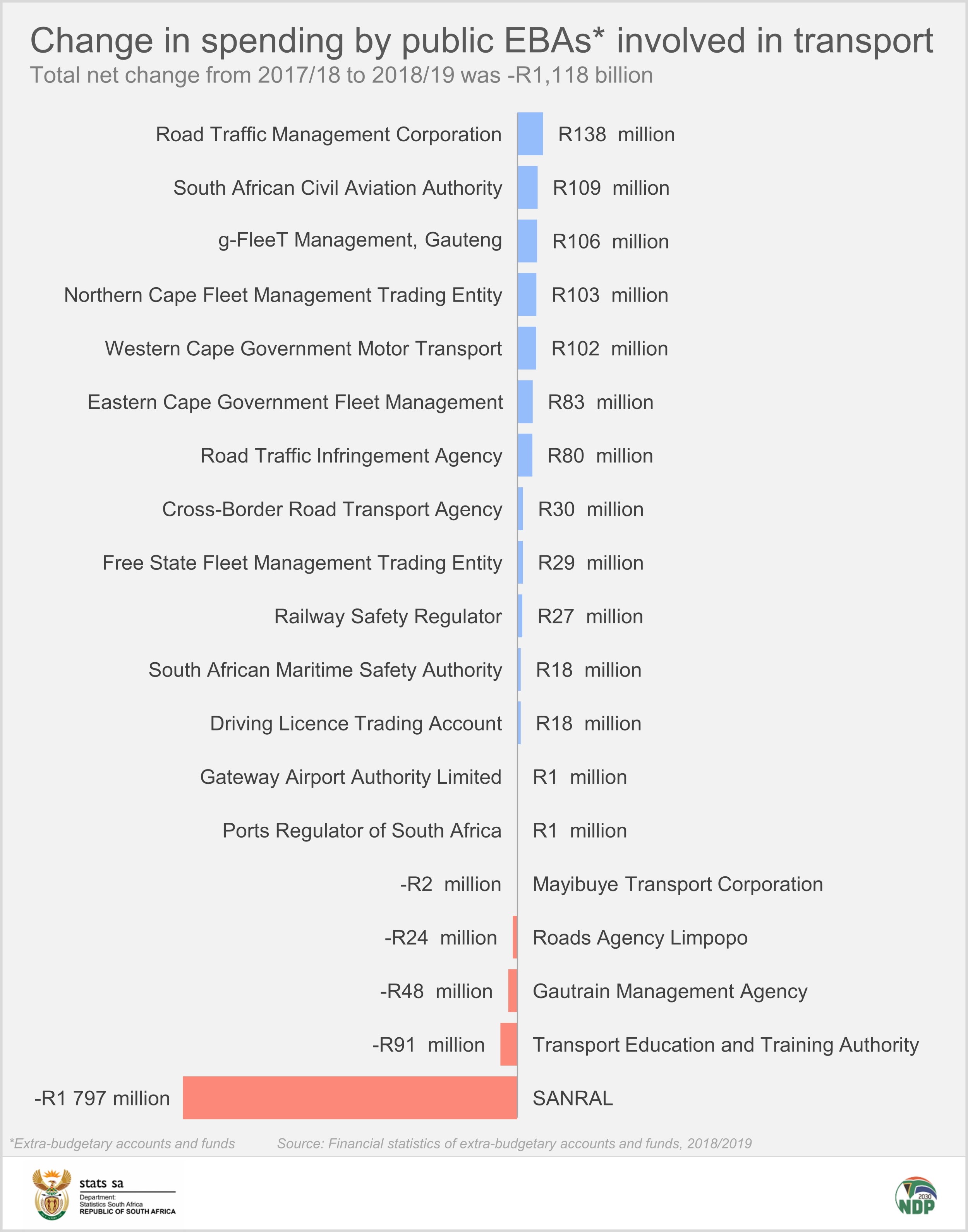 Total expenditure by extra-budgetary accounts and funds (EBAs) involved in transport fell by 3,5%, from R32,0 billion in 2017/18 to R30,9 billion in 2018/19.1 This is according to the latest Financial statistics of extra-budgetary accounts and funds report.