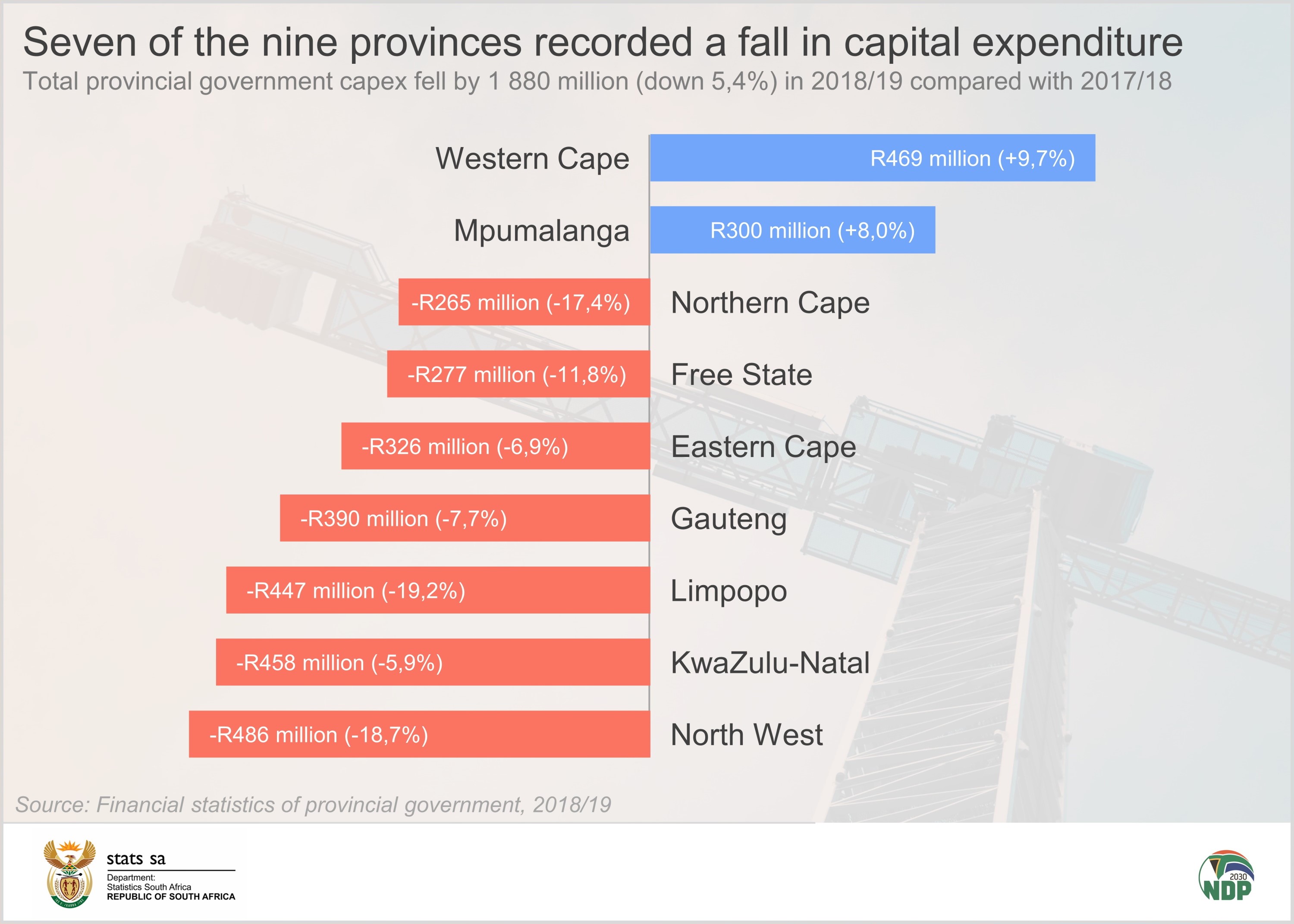 South Africa’s 123 provincial government departments recorded a decrease in infrastructure spending (referred to as capital expenditure) of R1,88 billion in 2018/19. This represents a fall of 5,4% compared with 2017/18.