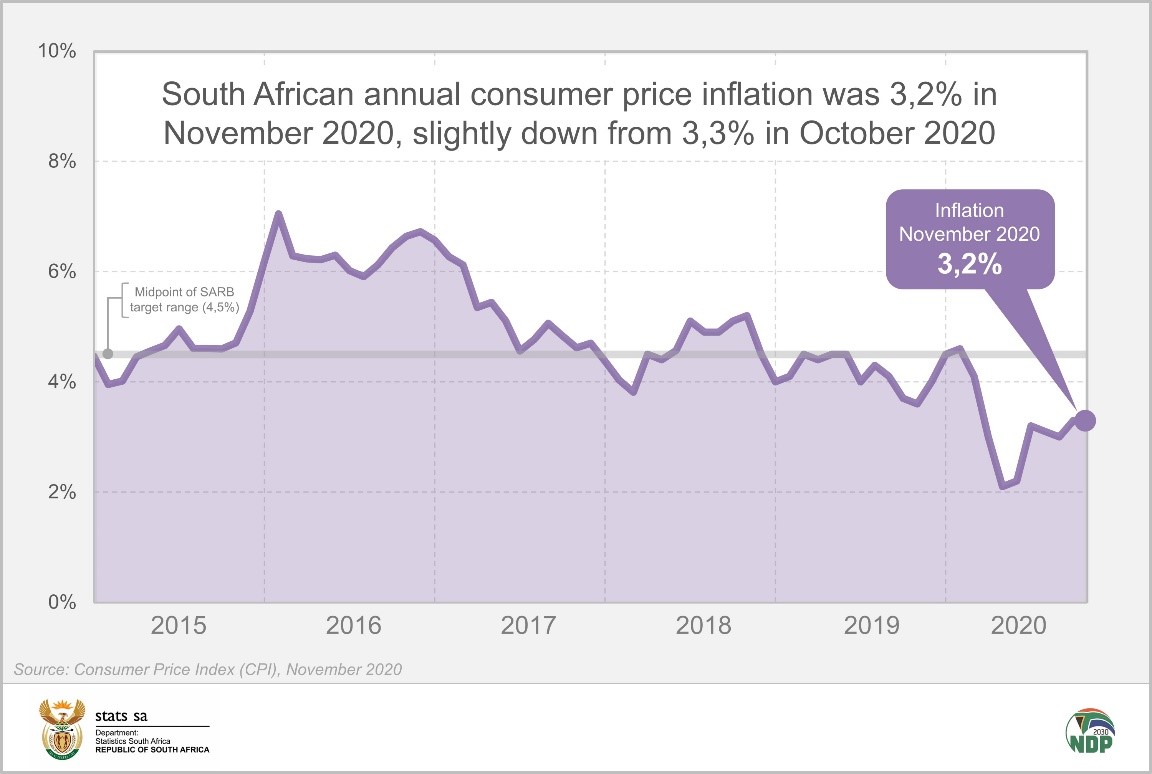 Annual consumer inflation retreated slightly in November, to 3,2% from 3,3% in October. There was no monthly change in the index.