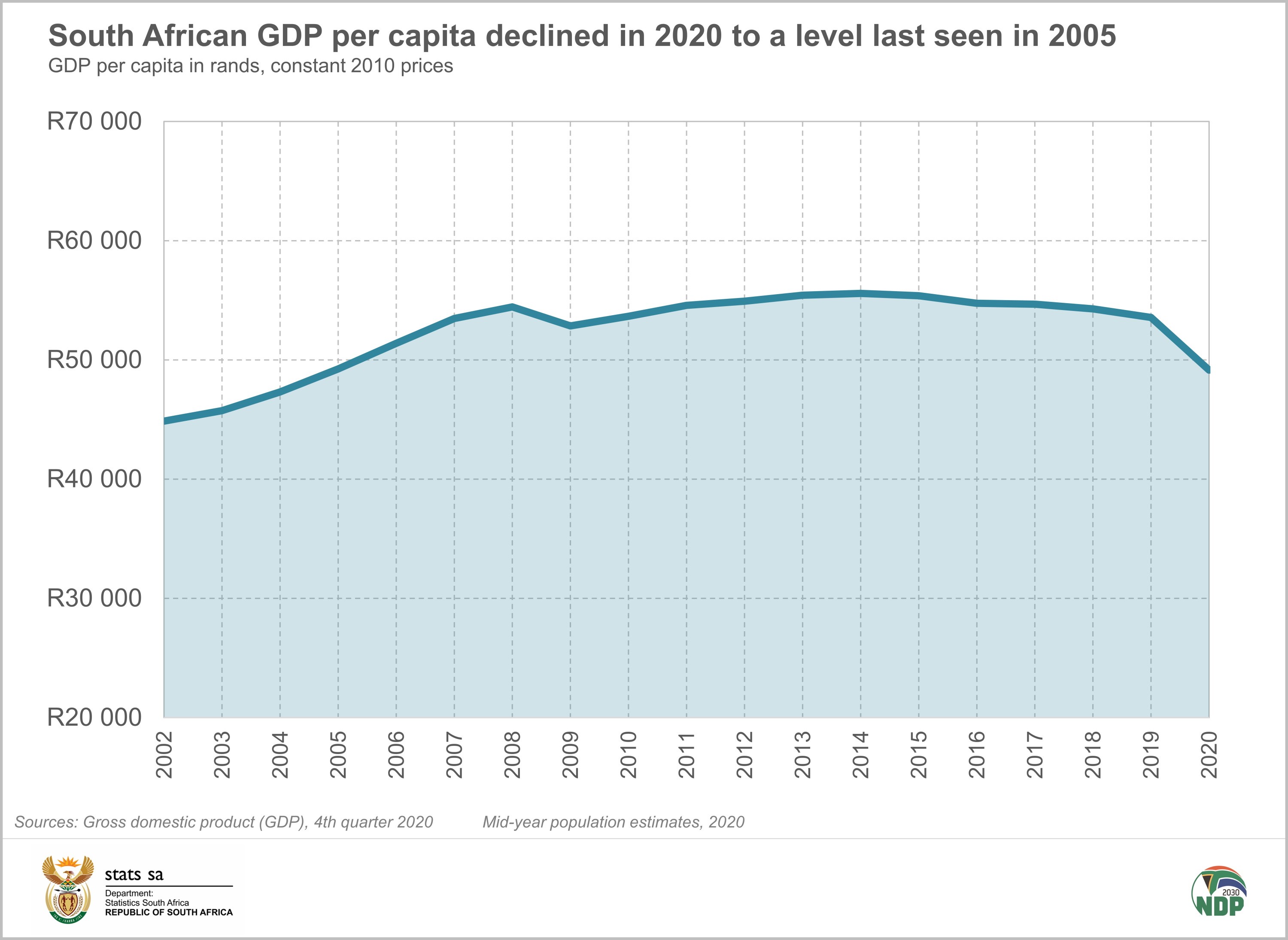 What does this mean for the wellbeing of everyone in the country? This is a complex question to answer, but a rough, quick measure is available in the form of GDP per capita. This represents the size of South Africa’s economy divided by the number of people who live in the country. It is a broad measure often used to make comparisons between countries regarding average living standards.
