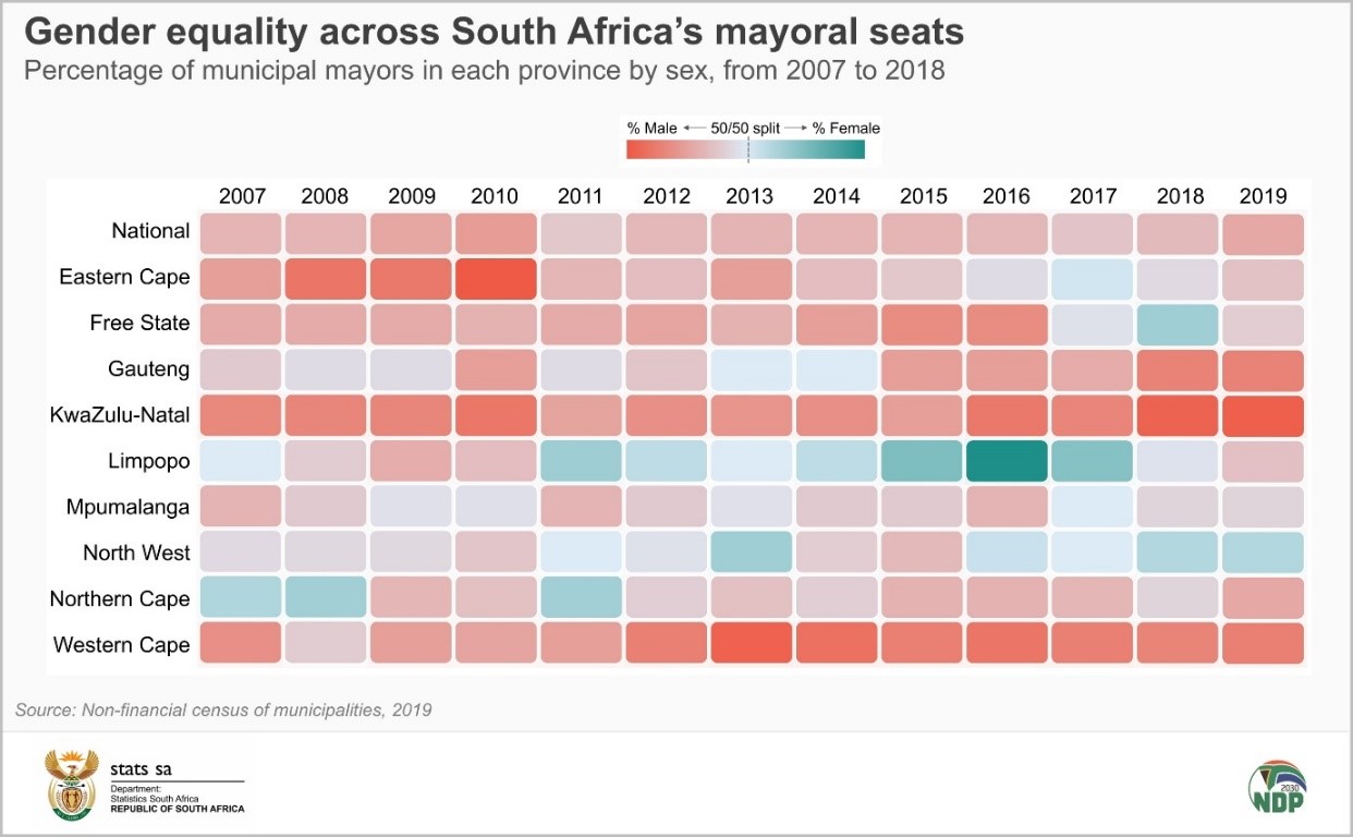 North West was the most representative, with 12 of its 22 (55%) municipalities headed by a female mayor. The province with the lowest female representation was KwaZulu-Natal (10 of 51 occupied mayoral seats, or 20%).