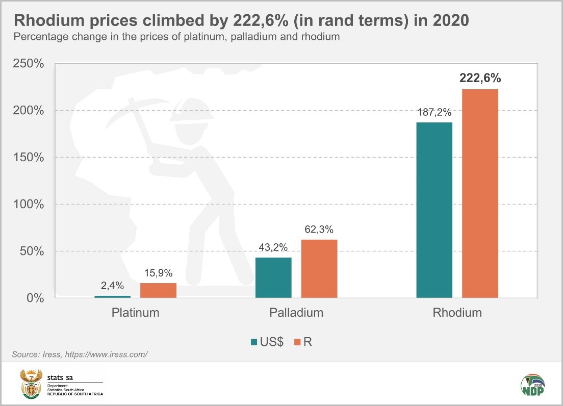 In 2020, prices for palladium (in US$ terms) increased by 43,2% and rhodium by 187,2%. In rand terms, rhodium prices climbed by 222,6%. These figures were calculated from data sourced from Iress.1
