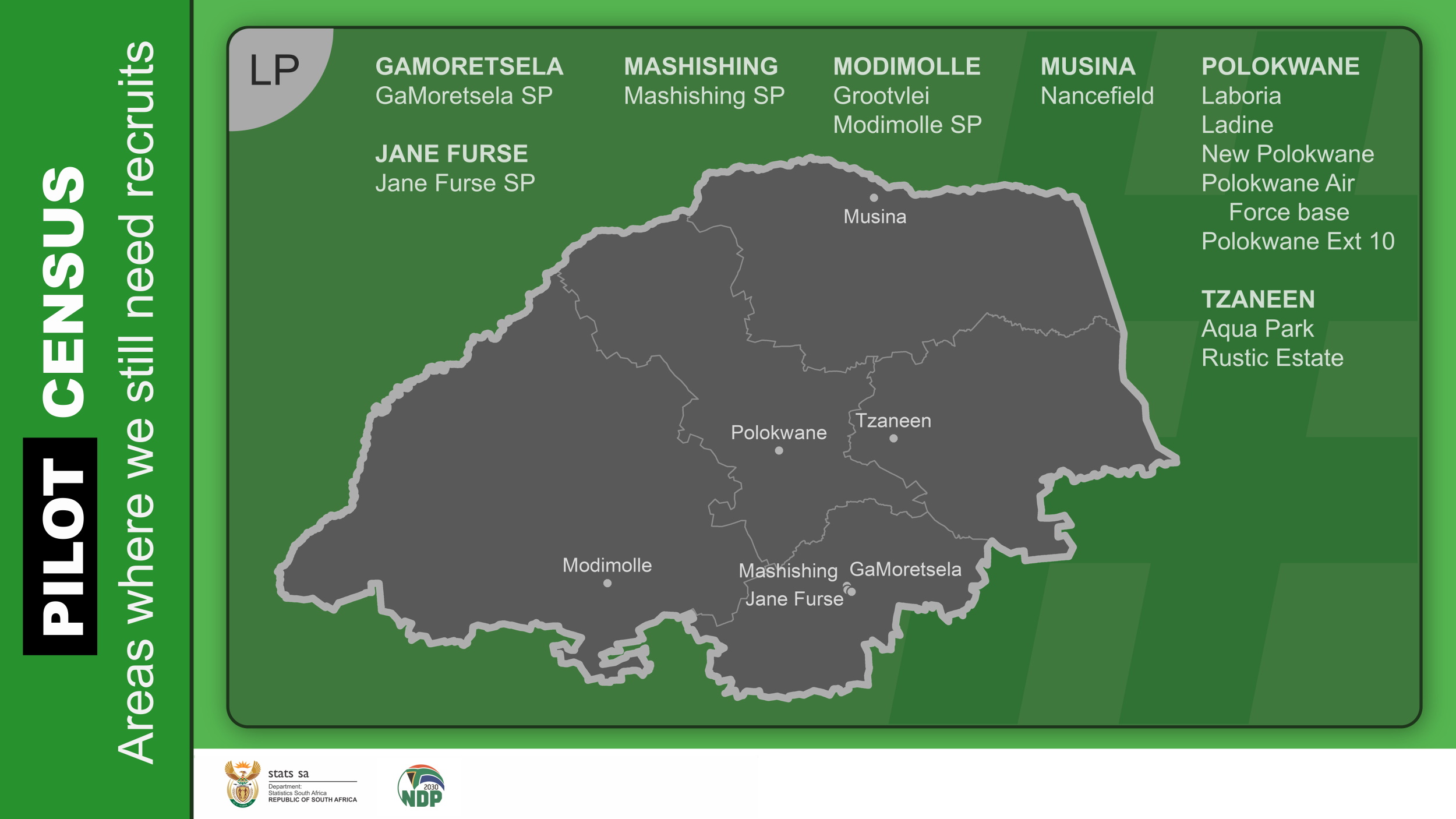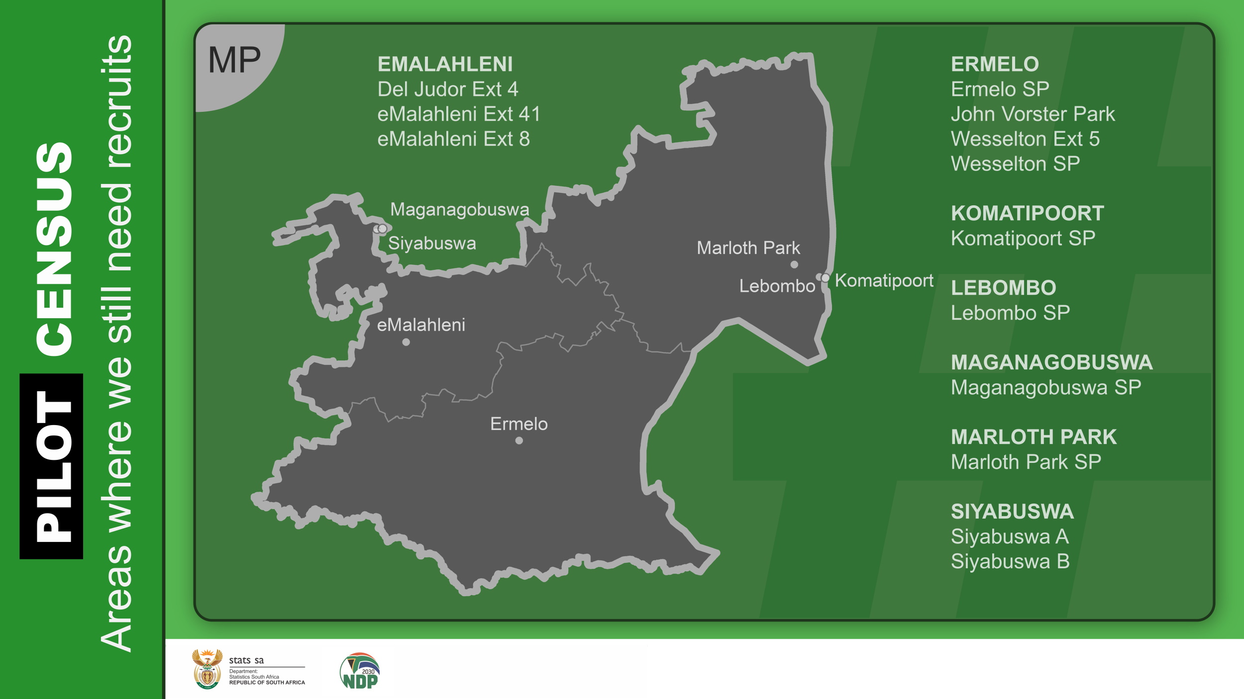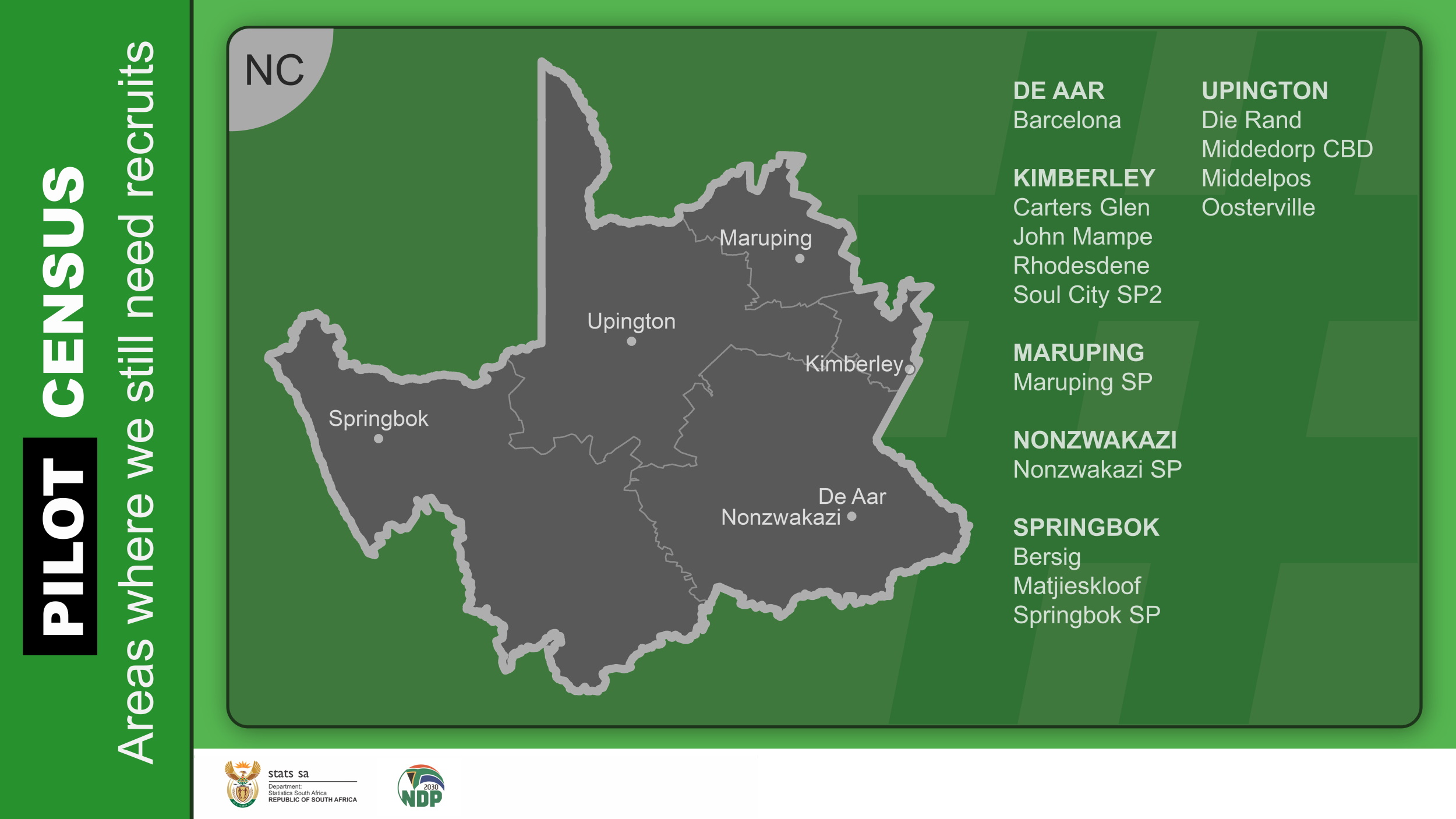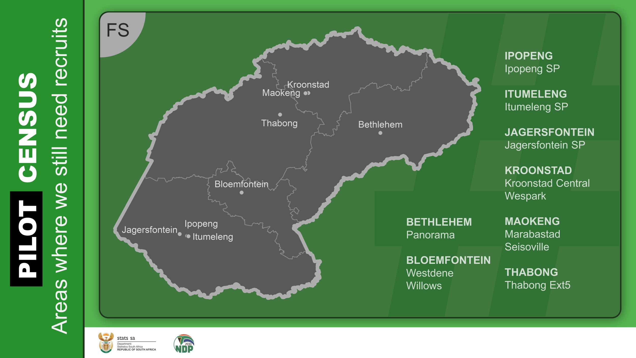 When the main census goes into field, we will need people from every corner of the country. While these specific areas are being targeted, we encourage all job-seekers with the relevant qualifications to register on Stats SA’s HR Database.