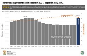 Between 1st July 2020 and 30th June 2021, two waves of the pandemic swept across the country and, by the 11th June 2021, the National Institute for Communicable Diseases (NICD) reported that the country had technically entered a third wave. The second wave was driven by the beta variant of the COVID-19 virus while the third wave is driven by the delta variant, the most contagious version of the coronavirus to date. These waves resulted in significantly higher proportions of deaths in the country than would normally have occurred. As a result of this rise in deaths, life expectancy at birth declined significantly.