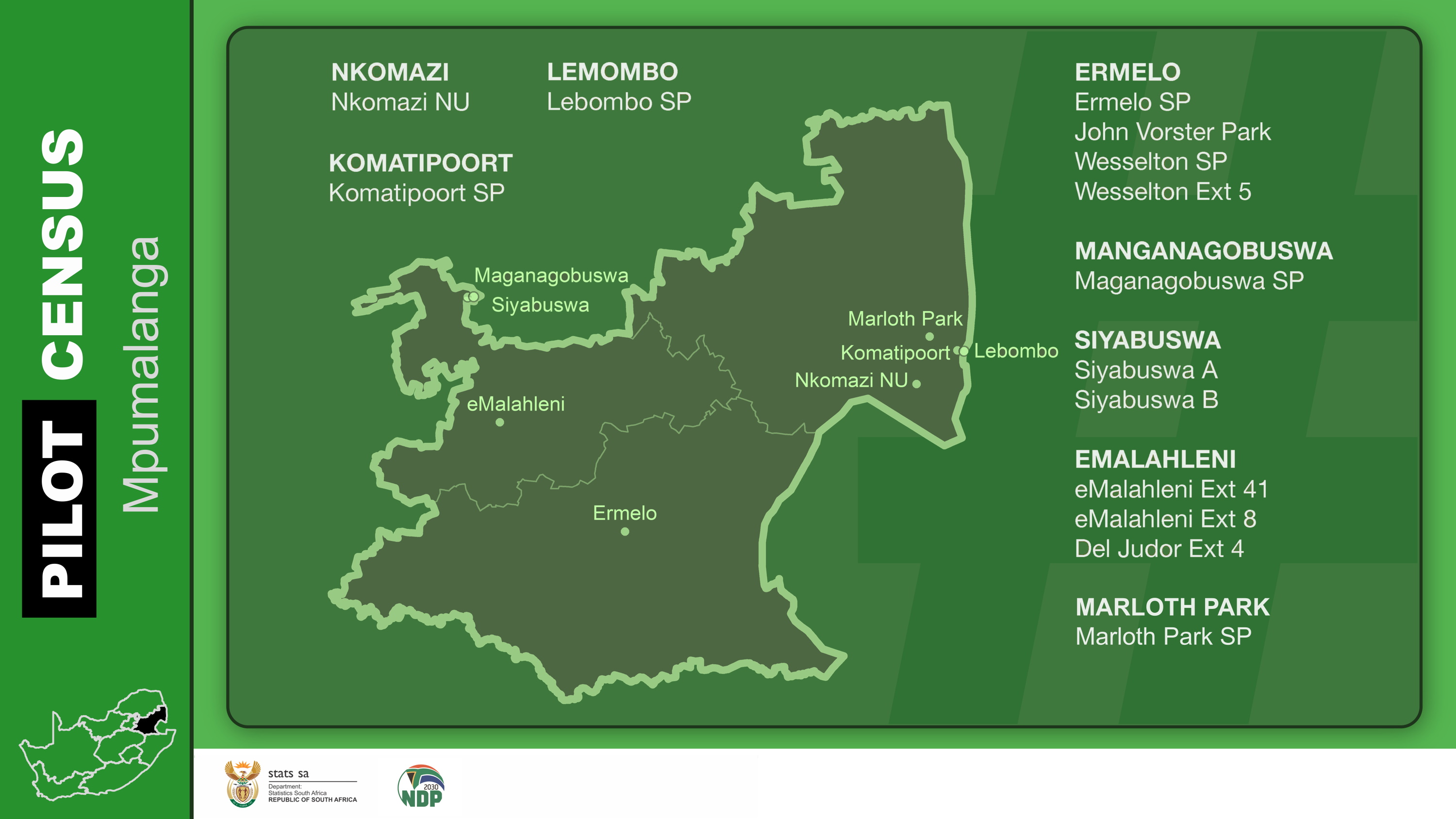 A census is a total count of the population; it also collects information on the socio-economic aspects such as employment and access to basic services. Participating in the Pilot Census will help with planning for the census. Stats SA urges all households to cooperate with our fieldworkers.