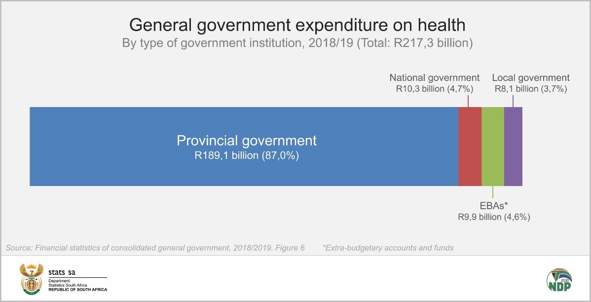 Provincial government accounted for the bulk (87%) of the R217 billion. This is expected, as provincial government is responsible for maintaining and administrating the nation’s public hospitals and clinics. National government accounted for 4,7%, and EBAs 4,6%.
