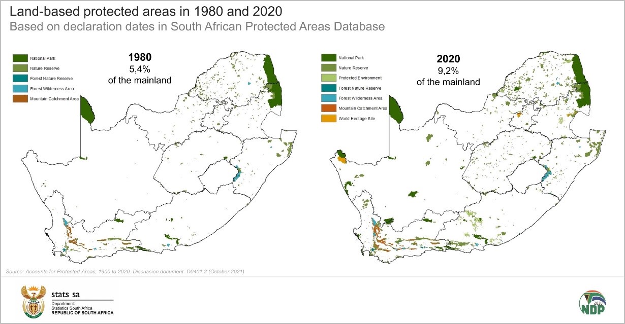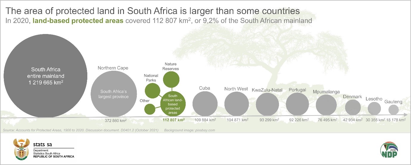 National Parks made up 3,5% of the mainland area of South Africa and contributed 37,4% to the protected area estate at the end of 2020, making the most significant contribution to protected areas in Mpumalanga and Northern Cape. National Parks make the largest proportional contribution to protecting four biomes: Desert, Nama-Karoo, Savanna and Succulent Karoo.
