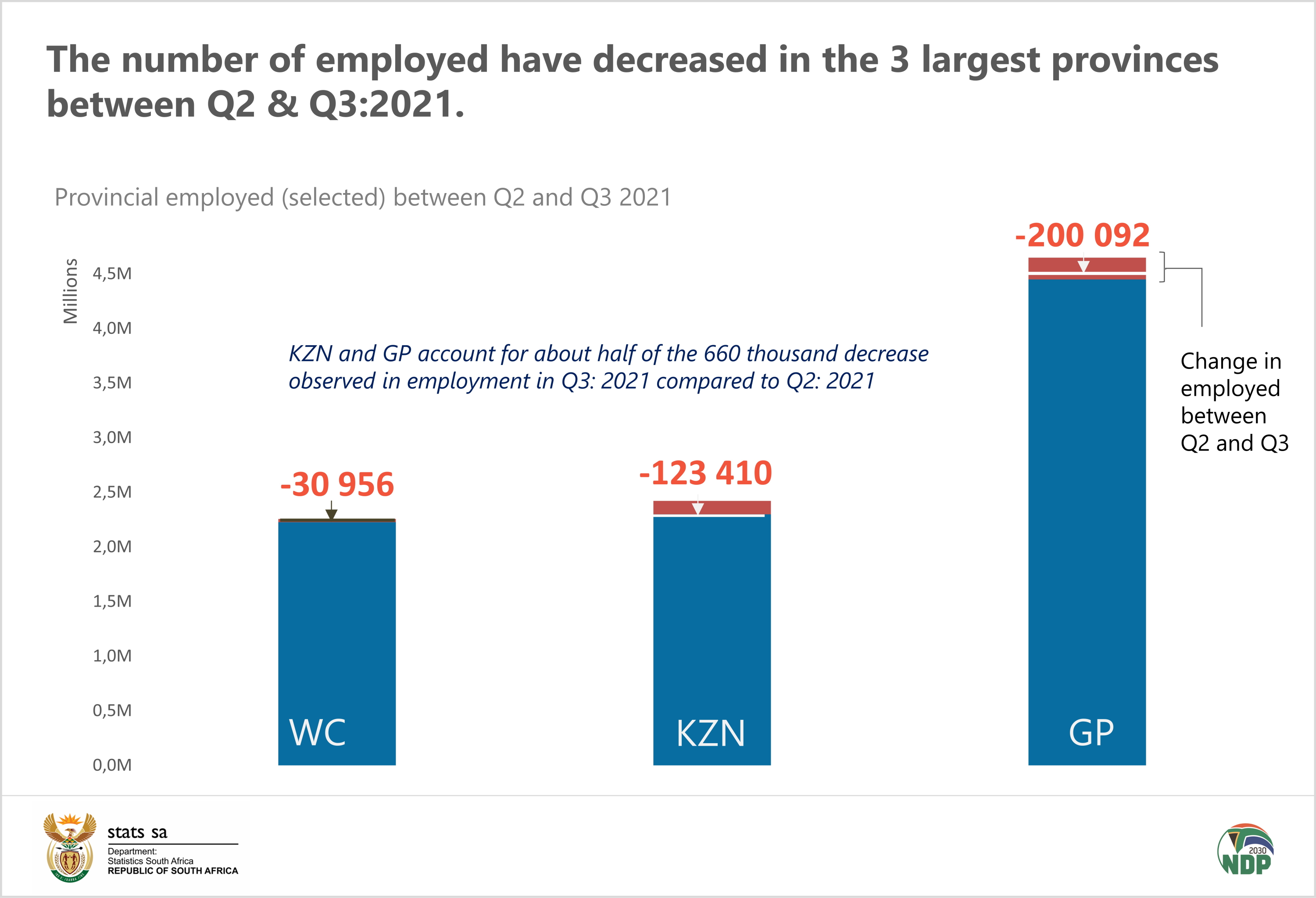 According to the Quarterly Labour Force Survey (QLFS) for the 3rd quarter of 2021, the number of employed persons declined by 660 000 to 14,3 million compared to the 2nd quarter of 2021.