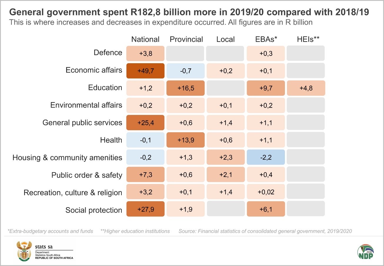 Government spent an additional R182,8 billion in 2019/20 compared with 2018/19. The matrix below breaks this down and provides a snapshot of what drove spending higher (in red) and what government spent less money on (in blue).