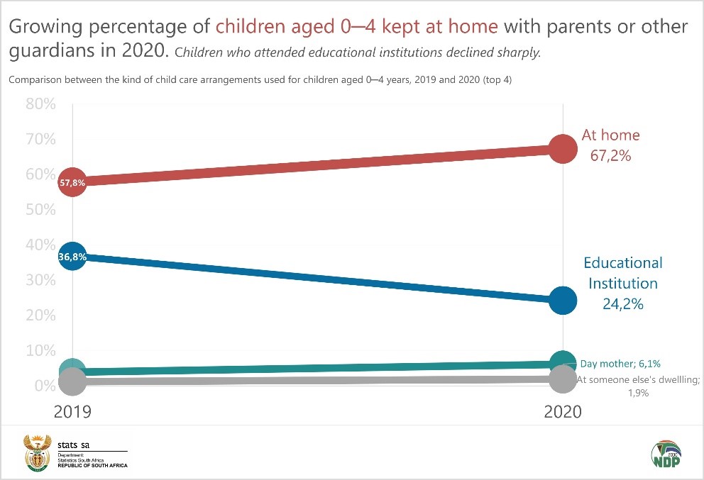 The percentage of children that attended grade R, pre-school, nursery school, crèche, and educare centres decreased from 36,8% in 2019 to 24,2% in 2020, while the percentage of children that remained at home with a parent, guardian, other adults or children increased from 57,8% to 67,2% during the same period.