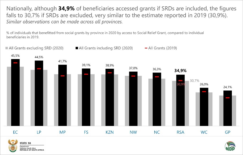 While the lockdowns and restrictions that were imposed impacted severely on peoples livelihood, social grants remained a vital safety net, particularly in the poorest provinces. The rollout of the temporary COVID-19 Social Relief of Distress grant (SRD) in 2020 played a central role in protecting individuals and households against the loss of income during this period. Nationally, 5,3% of individuals accessed the COVID-19 SRD grants in 2020. The results show that the percentage of individuals who accessed grants in 2020 increased to 34,9%, while the percentage of households that received at least one grant increased to 52,4%. It is notable that the percentage of persons that had access to at least one form of social grant decreased from 34,9% to 30,7% if the SRD grants are excluded.